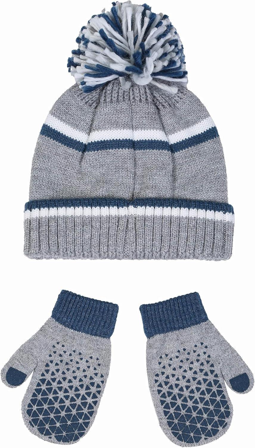 Reebok 2-Piece Baby/Toddler Winter Hat and Gripped Mittens Knitted Pom Beanie & Anti-Slip Gloves Cold Weather Accessories(Light Gray/Blue)