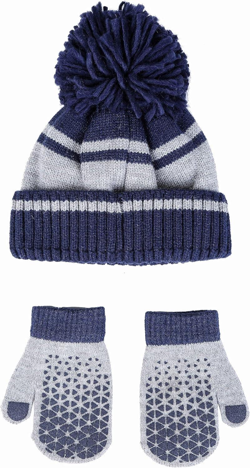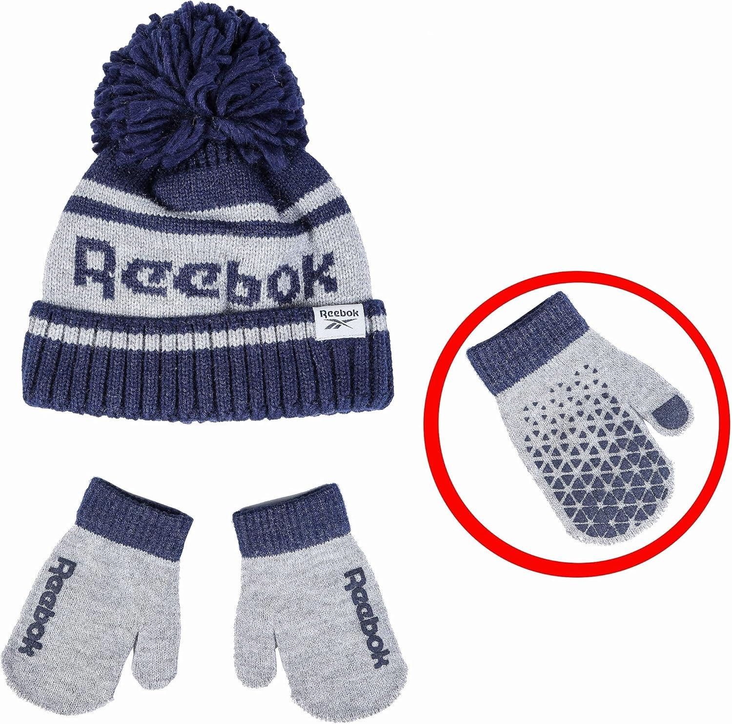 Reebok 2-Piece Baby/Toddler Winter Hat and Gripped Mittens Knitted Pom Beanie & Anti-Slip Gloves Cold Weather Accessories(Vector Navy/Light Gray)