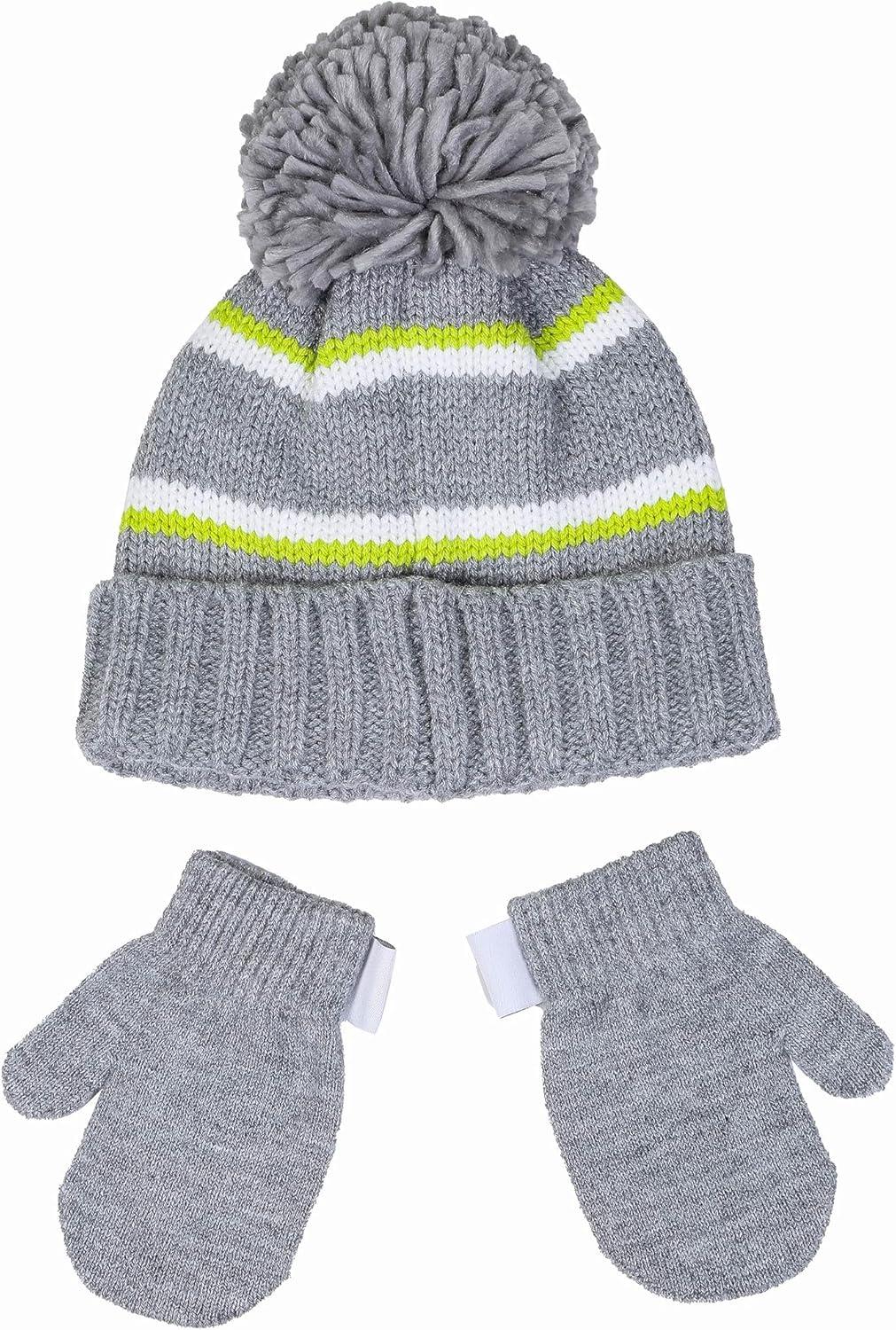 Reebok 2-Piece Baby/Toddler Winter Hat and Mittens Set Warm Knitted Pom Beanie & Gloves Kids Cozy Cold Weather Accessories(Gray/Lime)