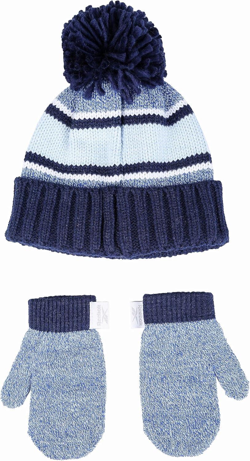 Reebok 2-Piece Baby/Toddler Winter Hat and Mittens Set Warm Knitted Pom Beanie & Gloves Kids Cozy Cold Weather Accessories(Vector Navy/Light Blue)