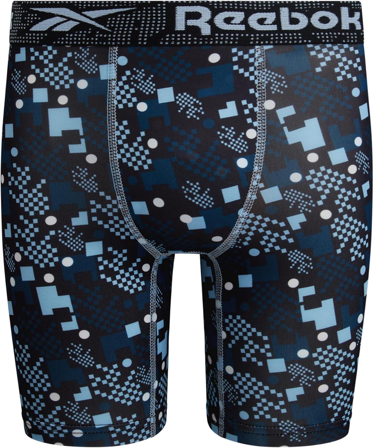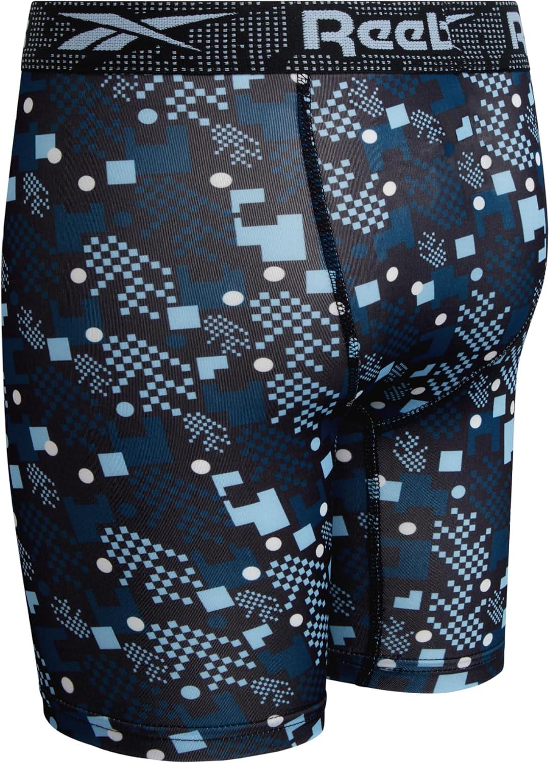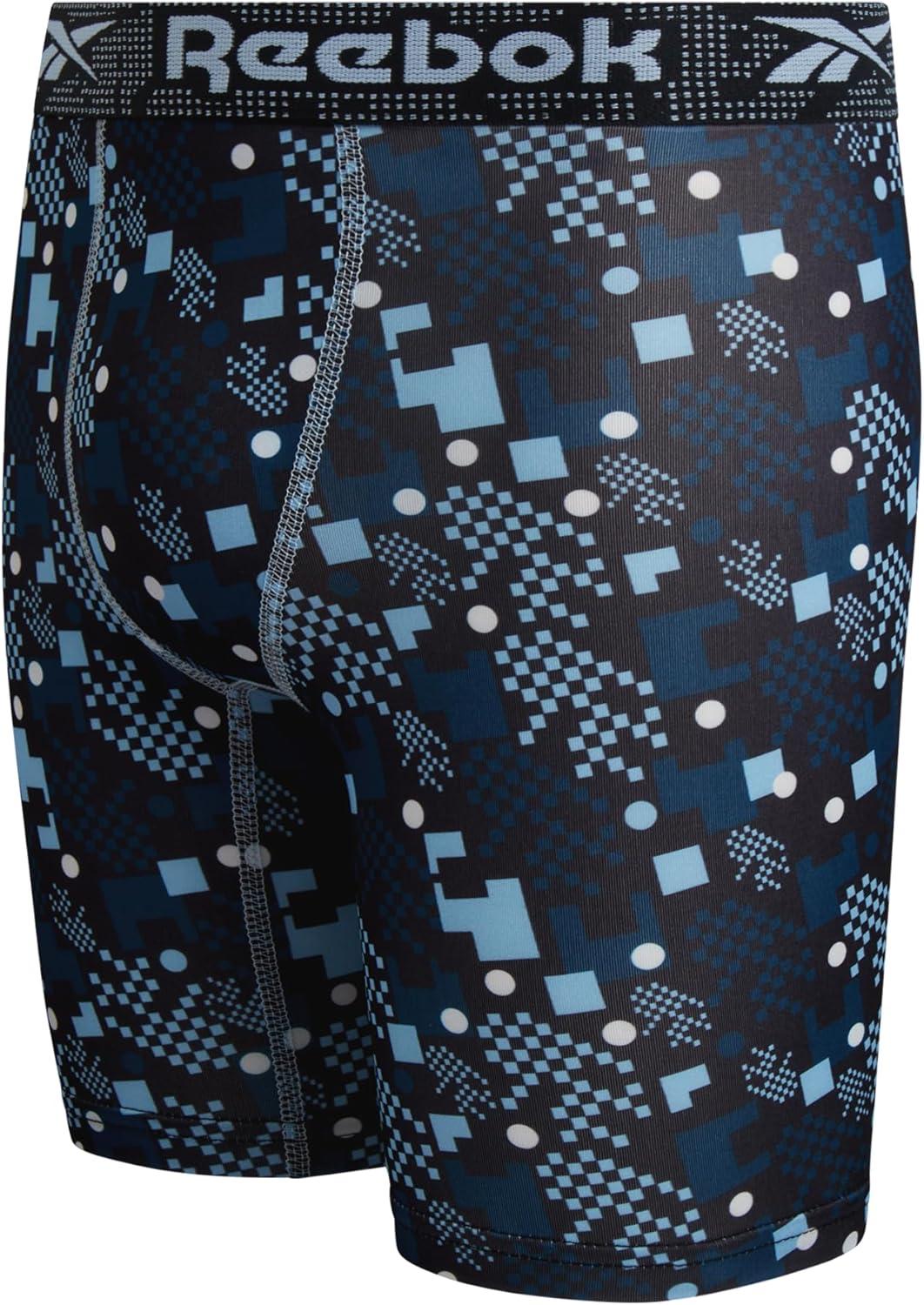 Reebok Boys Boxer Briefs – 3 Pack Performance Long Leg Boxer Briefs Boys Underwear with Support Pouch, 6” Inseam (6-18)(Dark Sea Print/Black/Dark Sea)