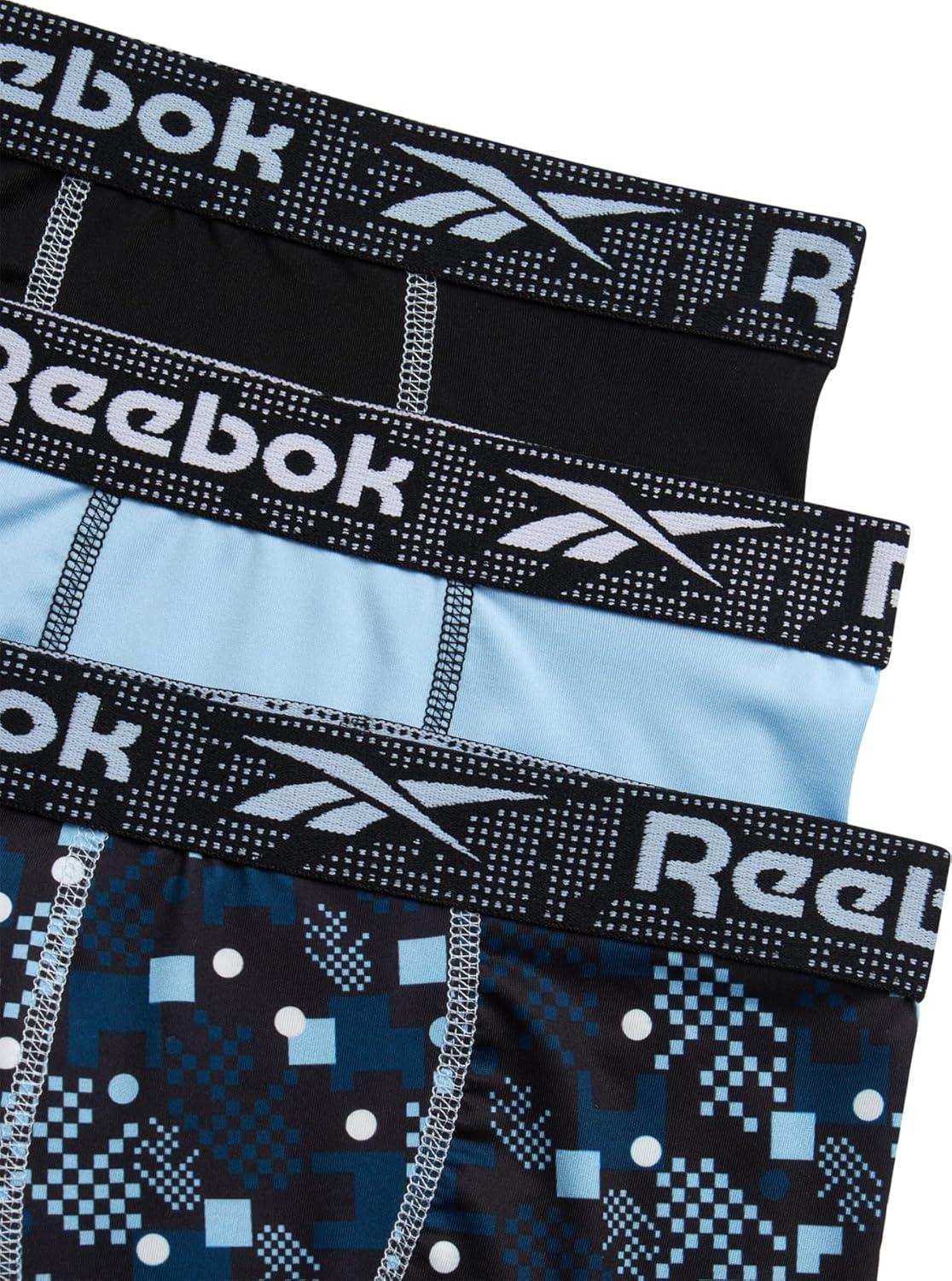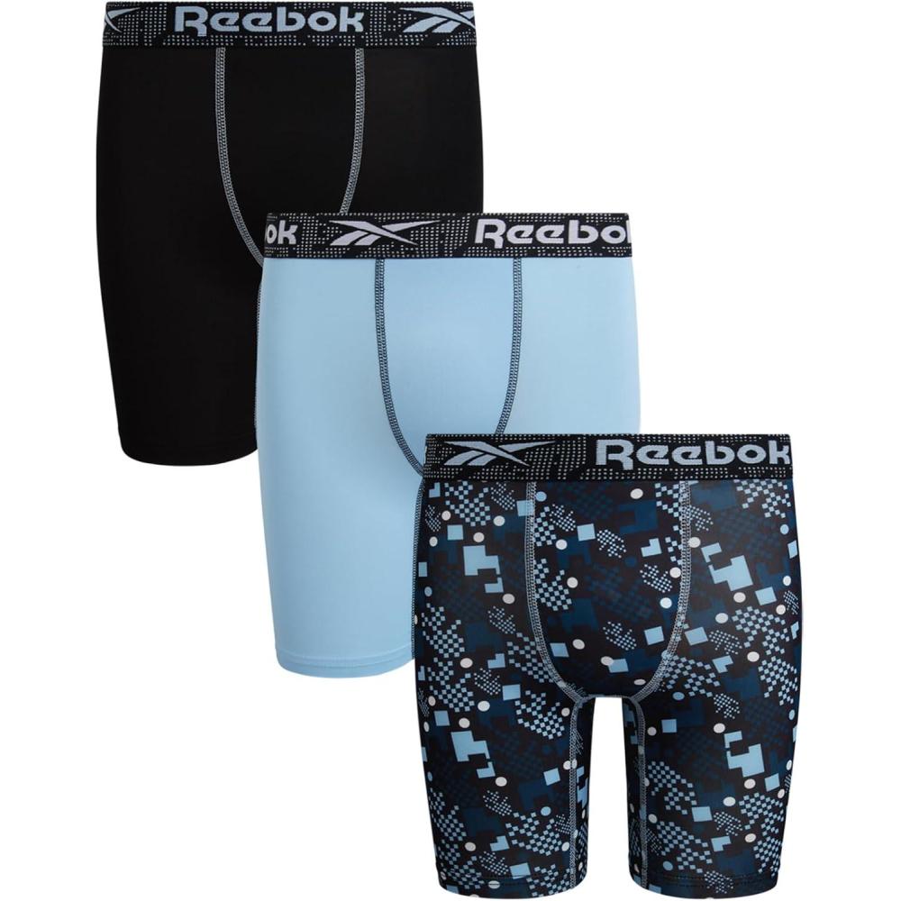 Reebok Boys Boxer Briefs - 3 Pack Performance 6” Inseam Long Leg Boxer Briefs Boys Underwear with Support Pouch (6-18)(Black Print/Clear Sky/Black)
