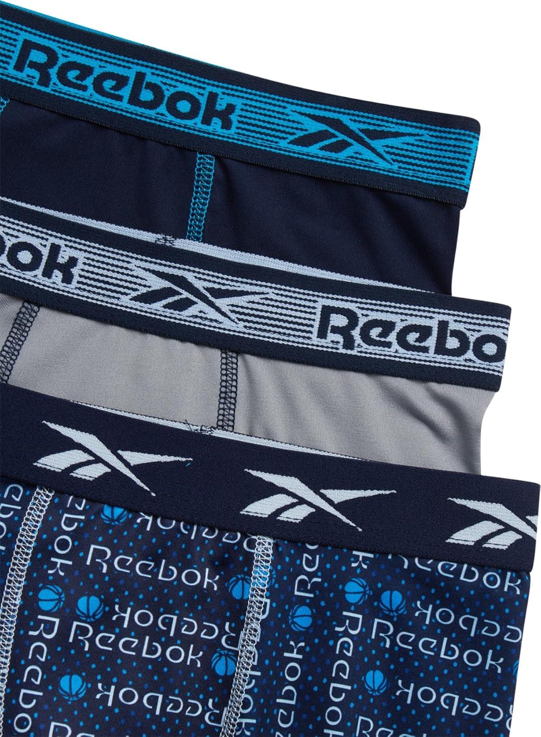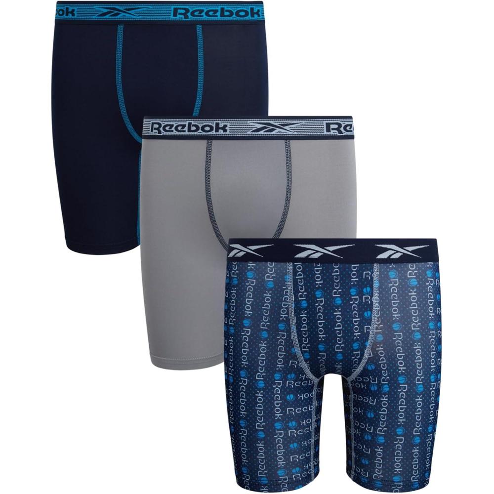 Reebok Boys Boxer Briefs – 3 Pack Performance 6” Inseam Long Leg Boxer Briefs Boys Underwear with Support Pouch (6-18)(Maritime Blue/Stone Grey/Atomic Blue Print)