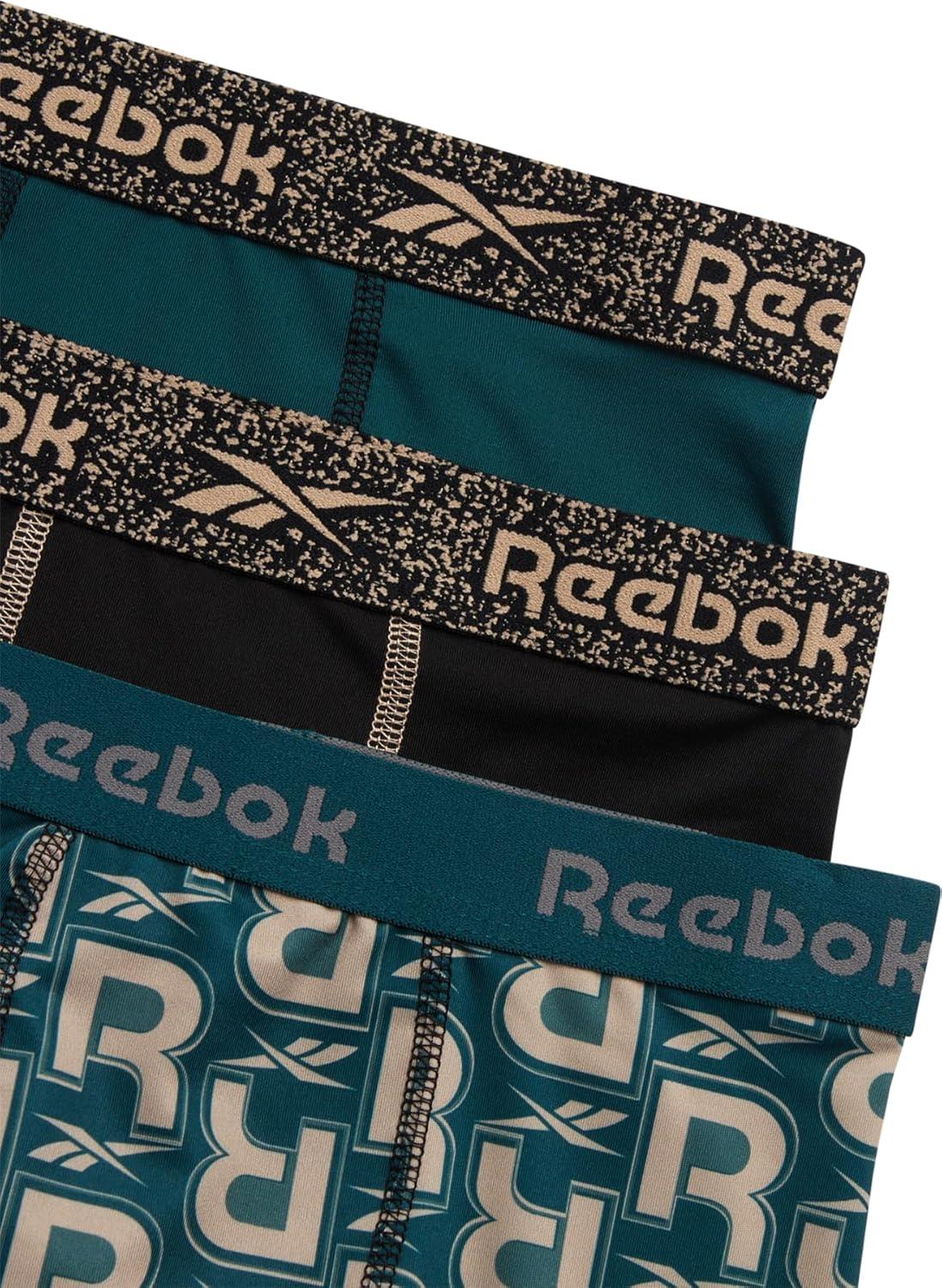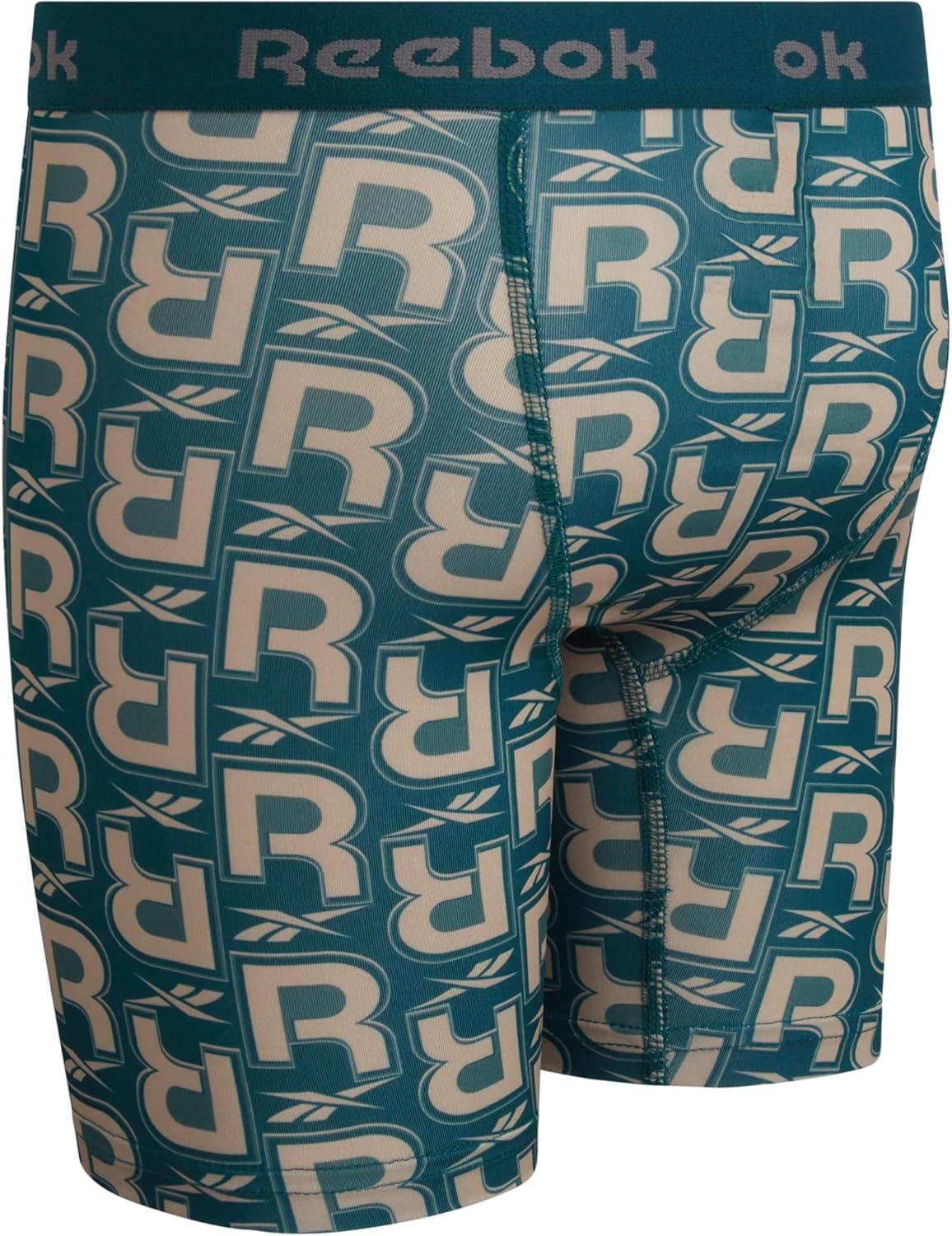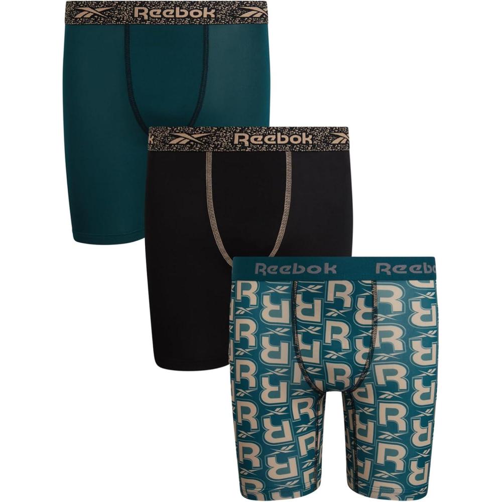 Reebok Boys Boxer Briefs - 3 Pack Performance Long Leg Boxer Briefs Boys Underwear with Support Pouch, 6” Inseam (6-18)(Dark Sea Print/Black/Dark Sea)