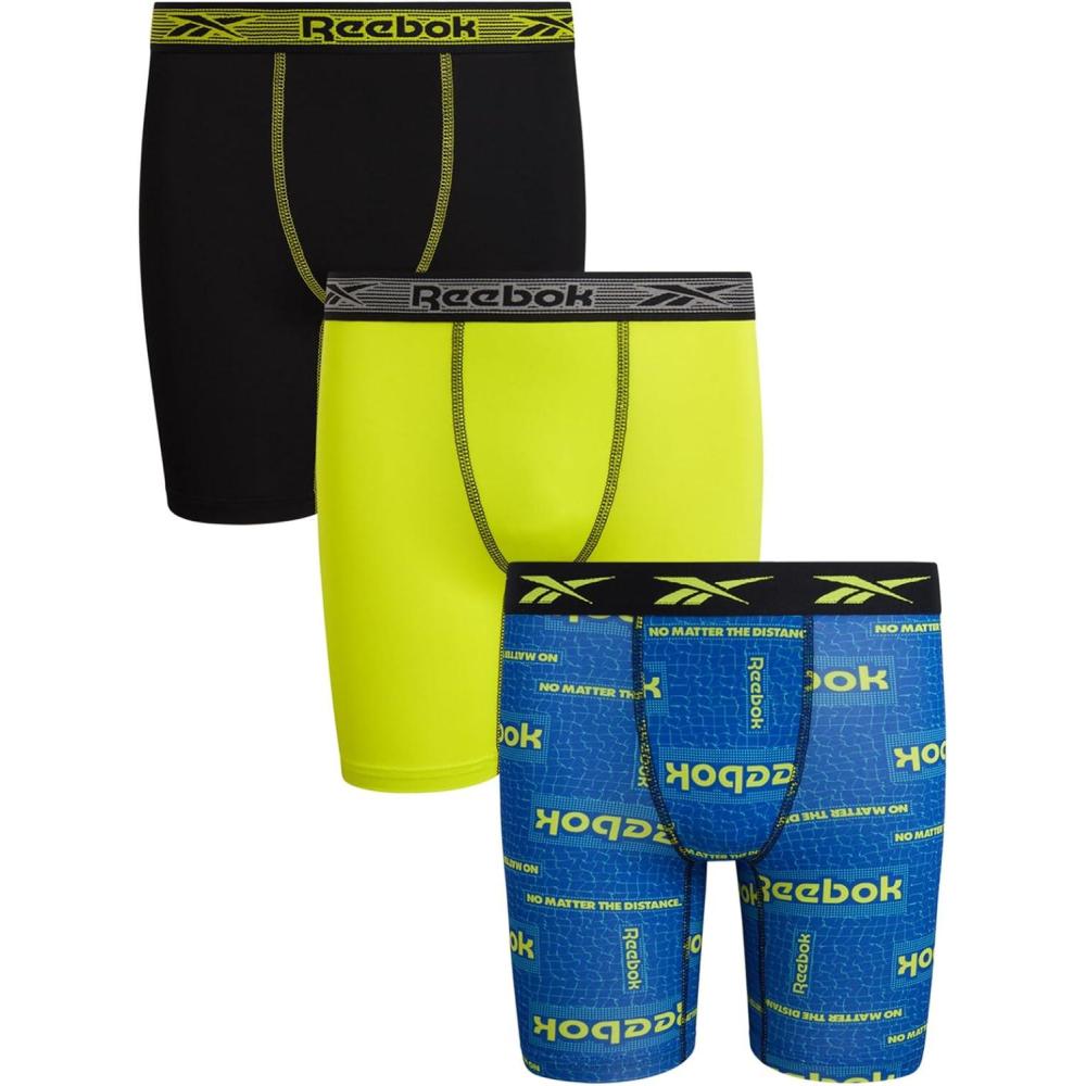 Reebok Boys Boxer Briefs – 3 Pack Performance Long Leg Boxer Briefs Boys Underwear with Support Pouch, 6” Inseam (6-18)(Black Print/Black/Green)