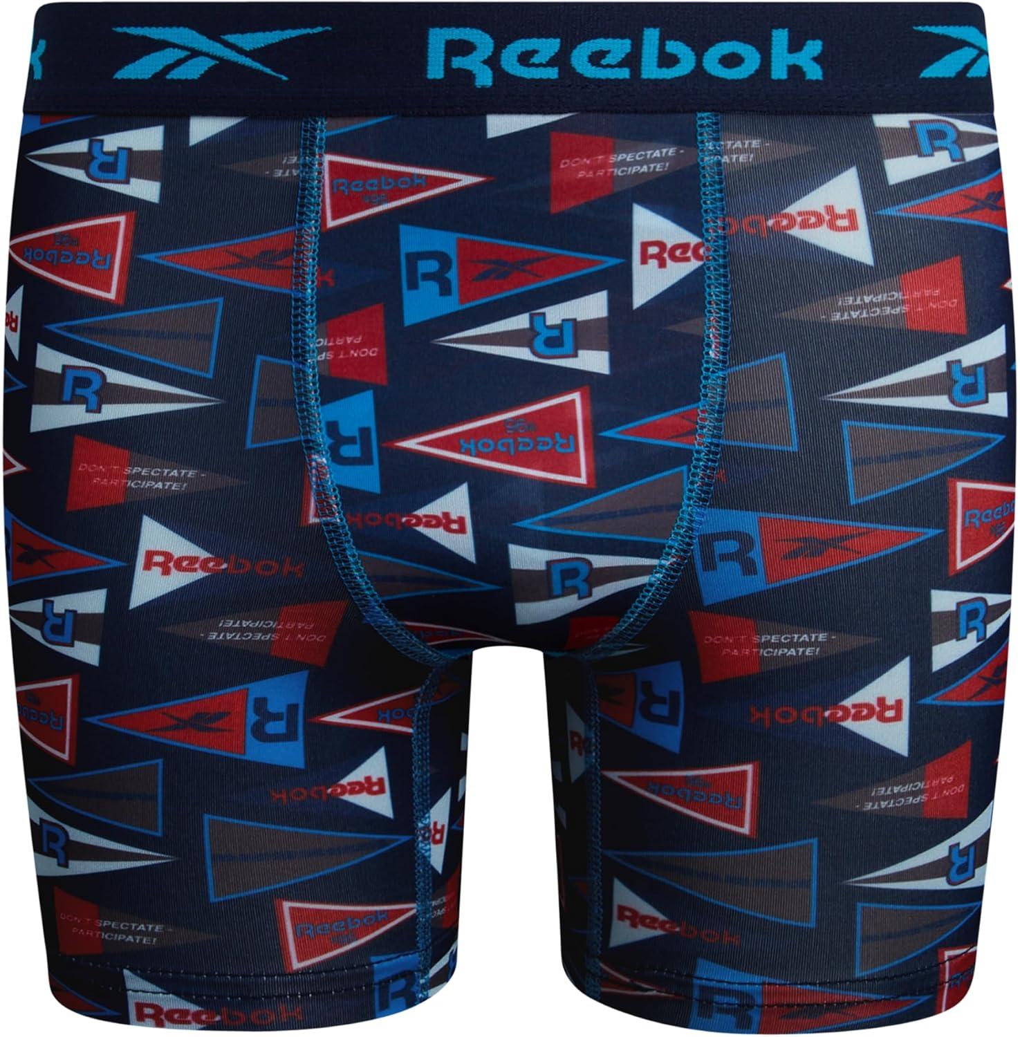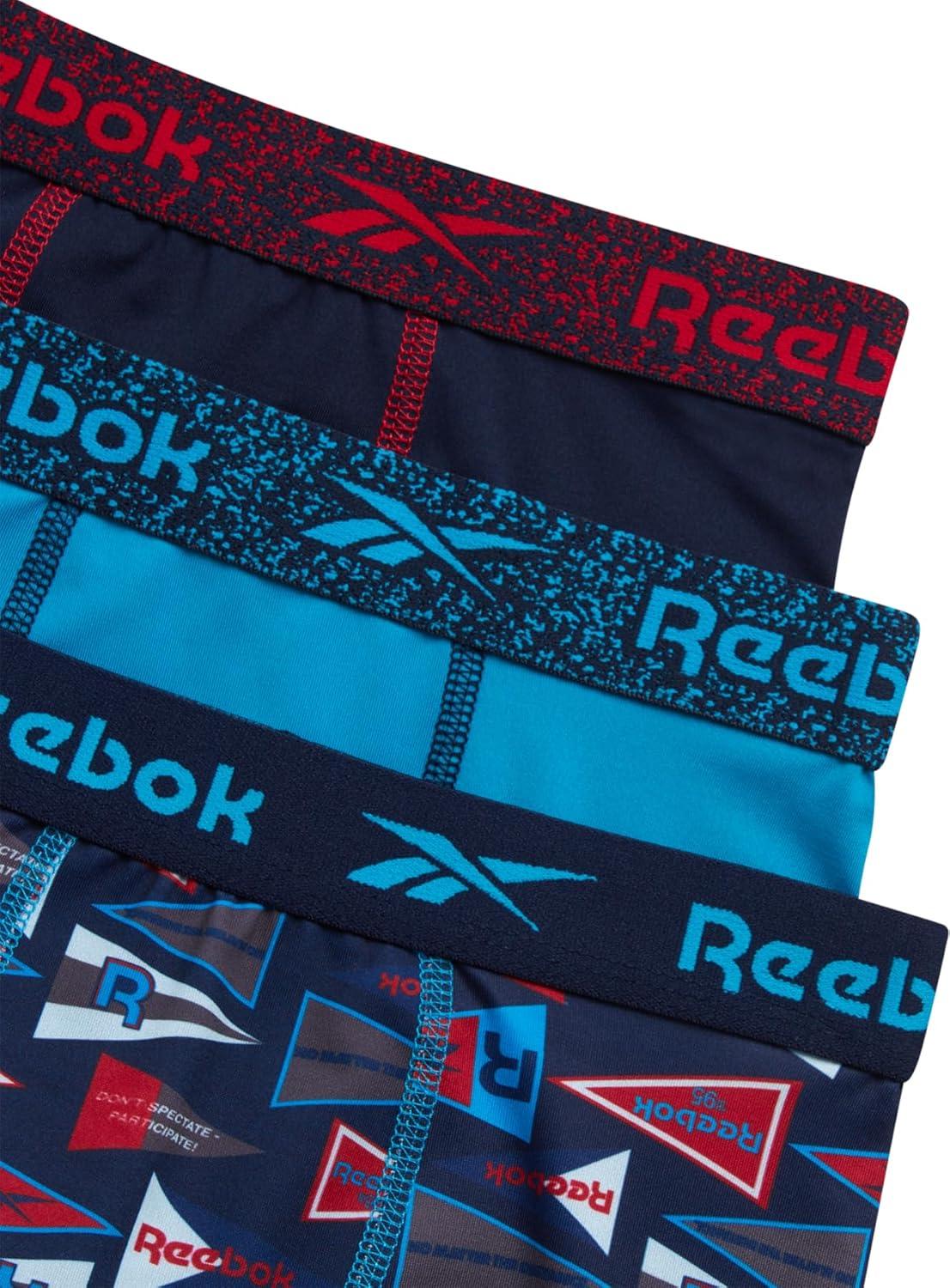 Reebok Boys Boxer Briefs – 3 Pack Performance Soft Stretch Breathable 5” Inseam Boxer Briefs Boys Underwear (6-18)(Maritime Blue Print/Maritime Blue/Atomic Blue)