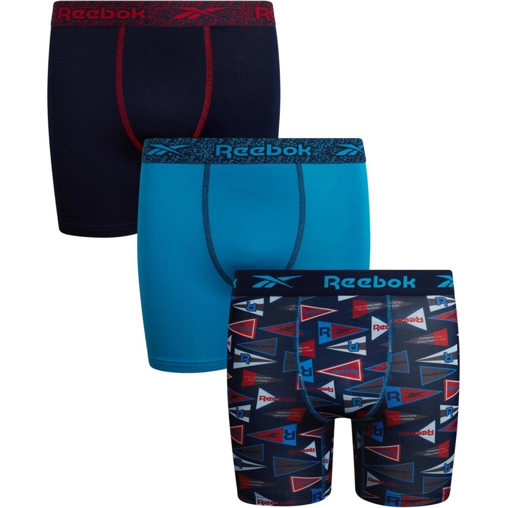 Reebok Boys Boxer Briefs - 3 Pack Performance Soft Stretch Breathable 5” Inseam Boxer Briefs Boys Underwear (6-18)(Maritime Blue Print/Maritime Blue/Atomic Blue)