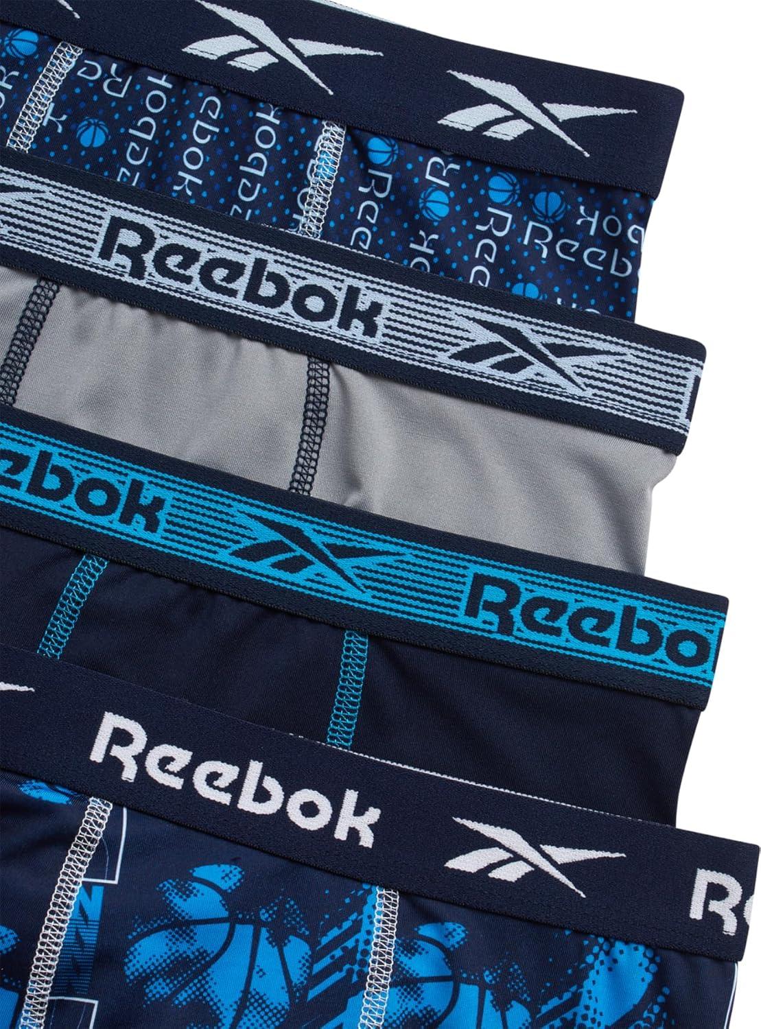 Reebok Boys Boxer Briefs – 4 Pack Performance Soft Stretch Breathable 5” Inseam Boxer Briefs Boys Underwear (6-18)(Maritime Blue Print/Stone Grey/Atomic Blue Print)
