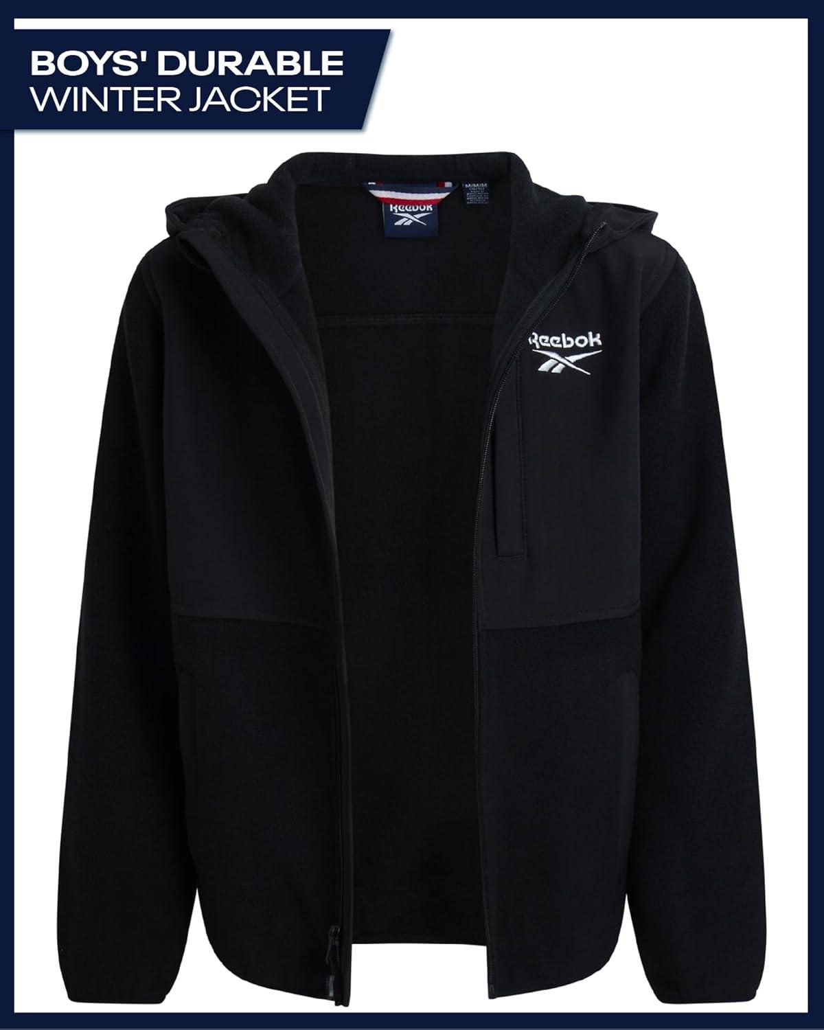 Reebok Boys Fleece Jacket - Weather Resistant Hooded Full Zip Polar Fleece Jacket for Boys - Lightweight Outerwear Jackets(Black Ink)
