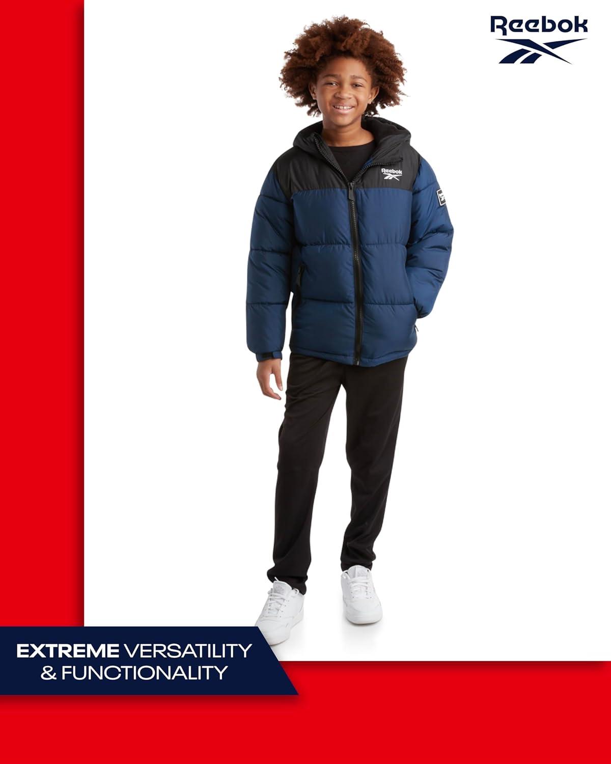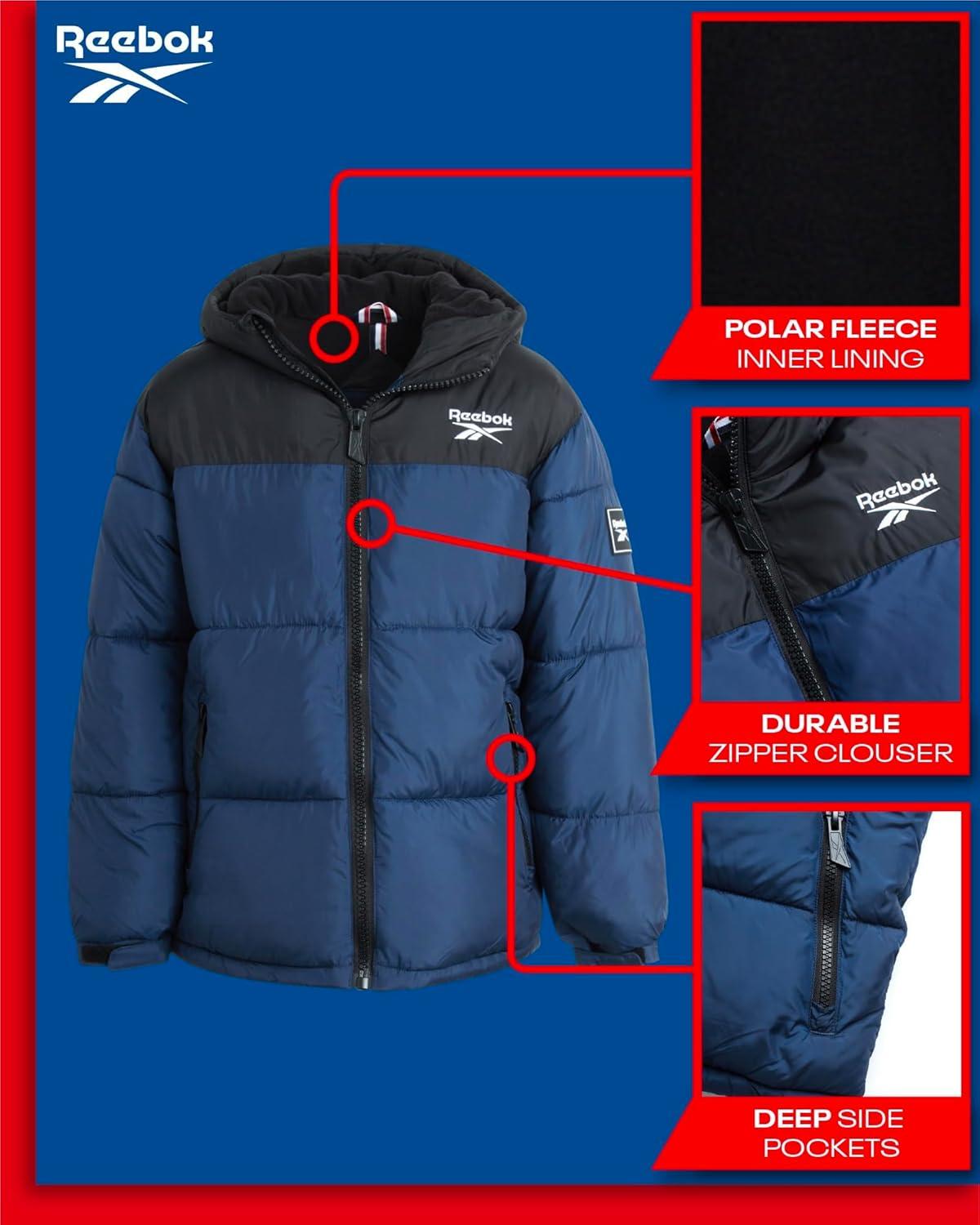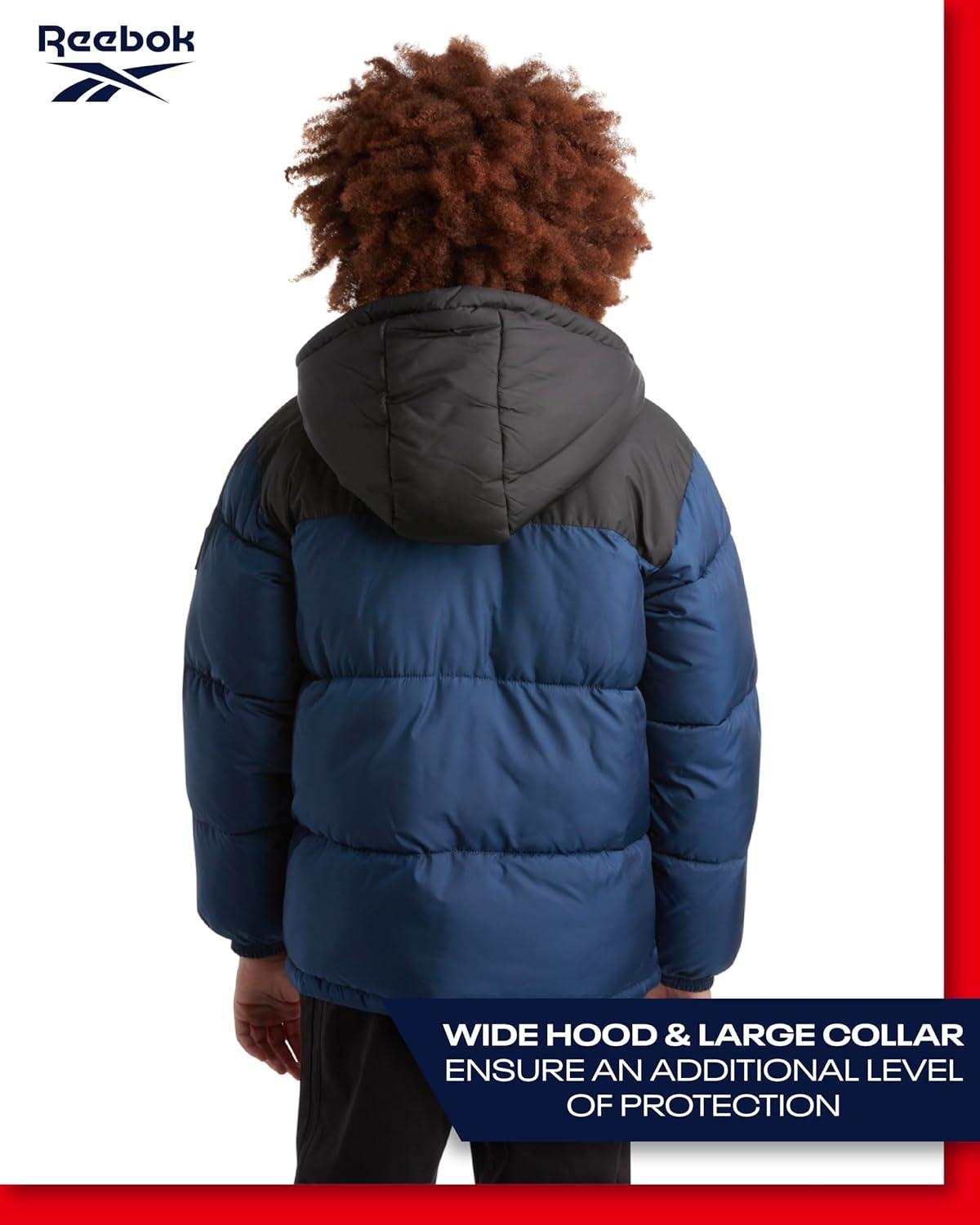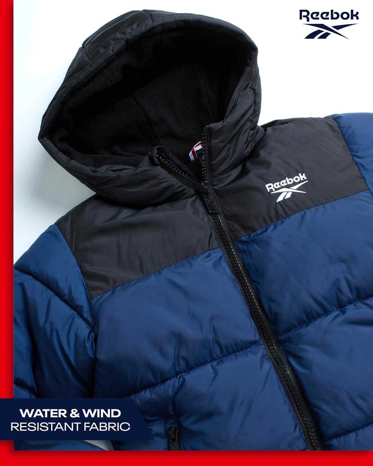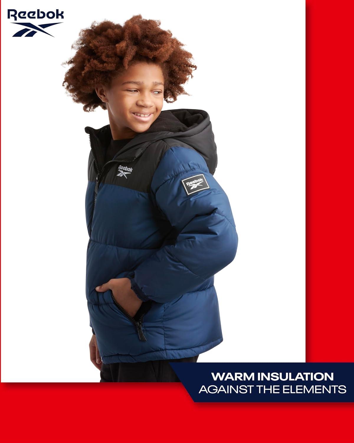 Keep him warm and protected with the Reebok Boys Puffer Jacket, a heavyweight boys winter coat designed for ultimate comfort and durability. Perfect for cold-weather adventures, this insulated boys puffer jacket combines superior warmth with a sleek design that works for school days, family outings, and outdoor play. Whether you’re searching for a winter jacket for boys, kids winter coat, or a reliable boys winter jacket, this option delivers everything you need for harsh winter conditions. Featuring a water- and wind-resistant shell, this boys winter coat offers outstanding protection against snow, rain, and cold winds. The insulated hood, full zip closure, and snap placket provide a secure fit that traps heat, making it perfect for winter sports or everyday wear. Designed to fit a range of sizes, from boys jackets size 7-8 to boys jackets size 14-16, it ensures growing kids stay warm all season long. Parents love the versatility of this coat—it’s ideal for boys winter coats size 10-12, boys winter coats size 14-16, or even as a puffer jacket for boys that pairs effortlessly with jeans, joggers, or school uniforms. Deep front pockets keep hands warm and essentials secure, making it practical for active lifestyles. Built with durability in mind, this kids winter jacket withstands tough weather and frequent washes without losing shape or insulation. It’s a must-have in any collection of boys' outerwear jackets & coats, offering the perfect combination of style, warmth, and function. For those cold winter days, trust Reebok to keep your child comfortable, protected, and looking great in this premium boys puffer jacket.