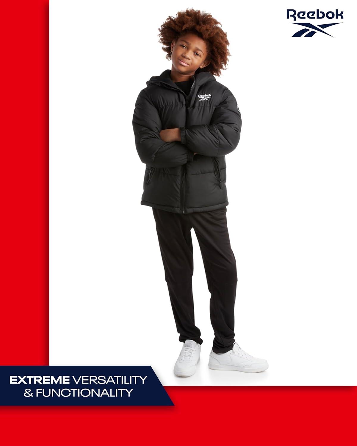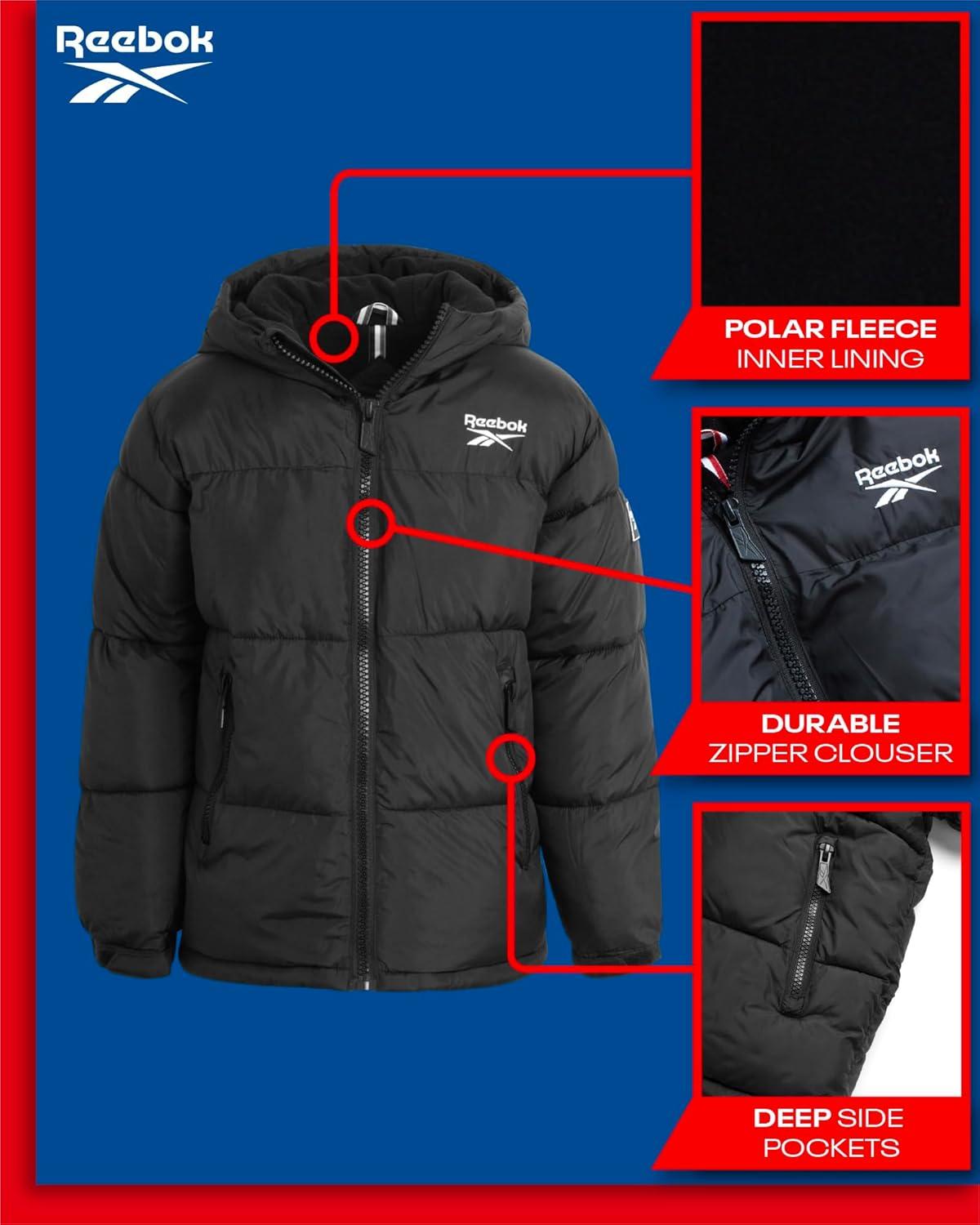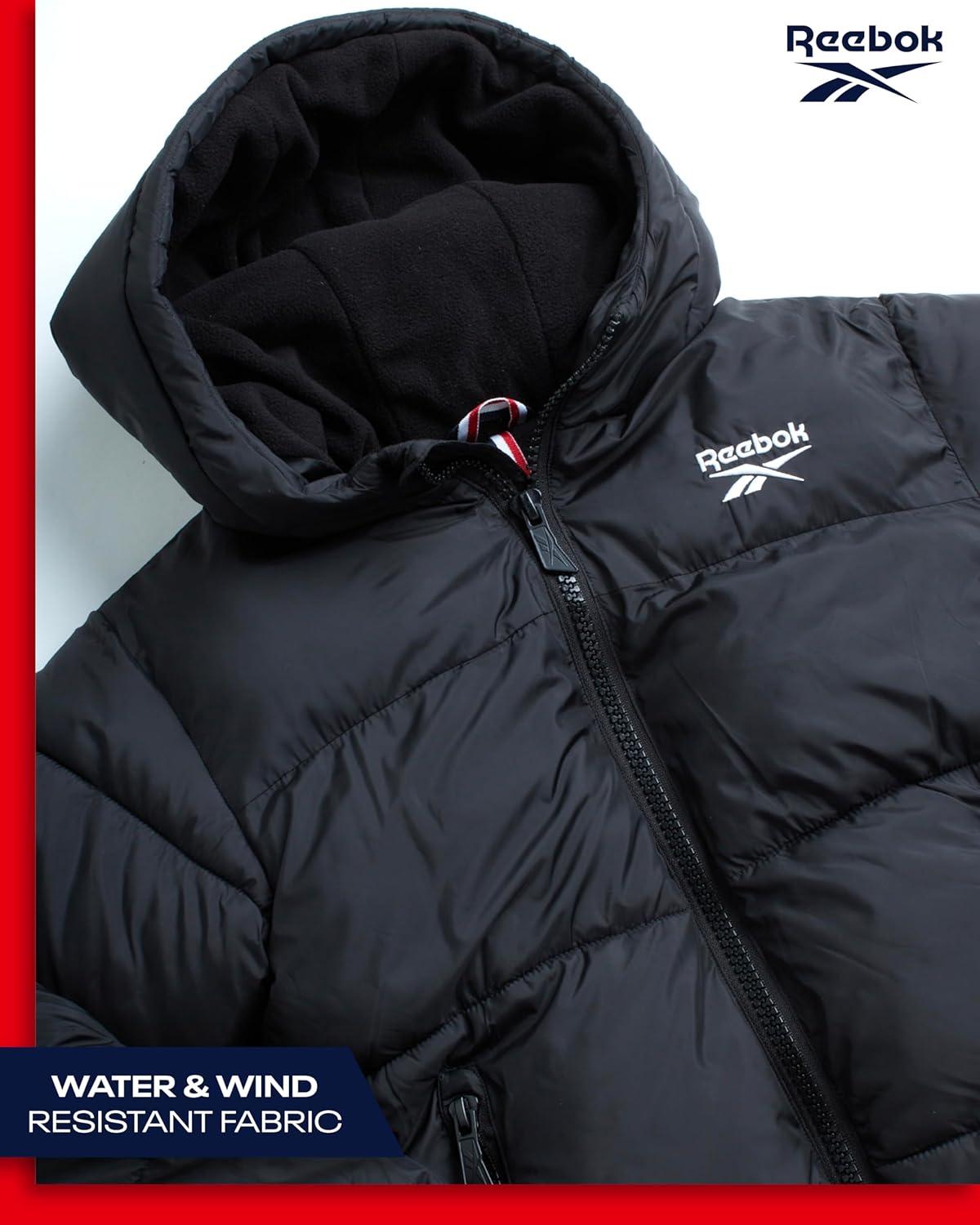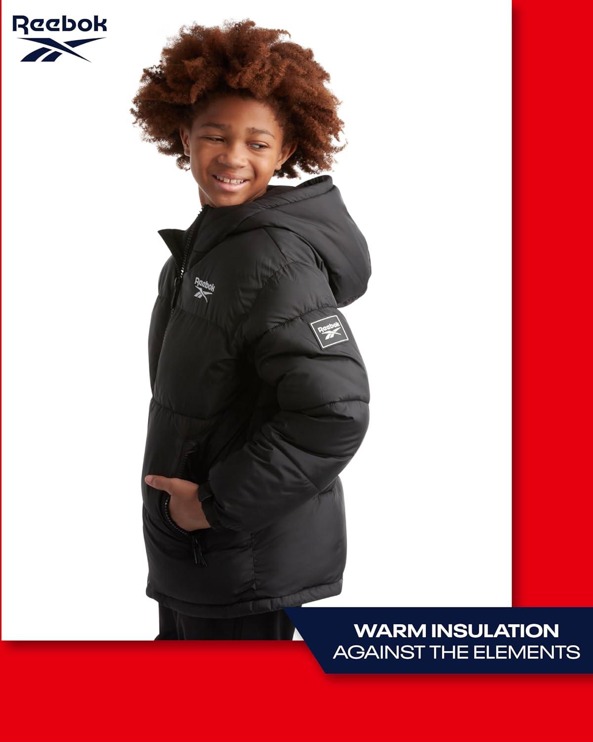 Reebok Boys Puffer Jacket - Heavyweight Water & Wind Resistant Quilted Boys Winter Coat - Fleece Insulated Kids Winter Jacket(Black)