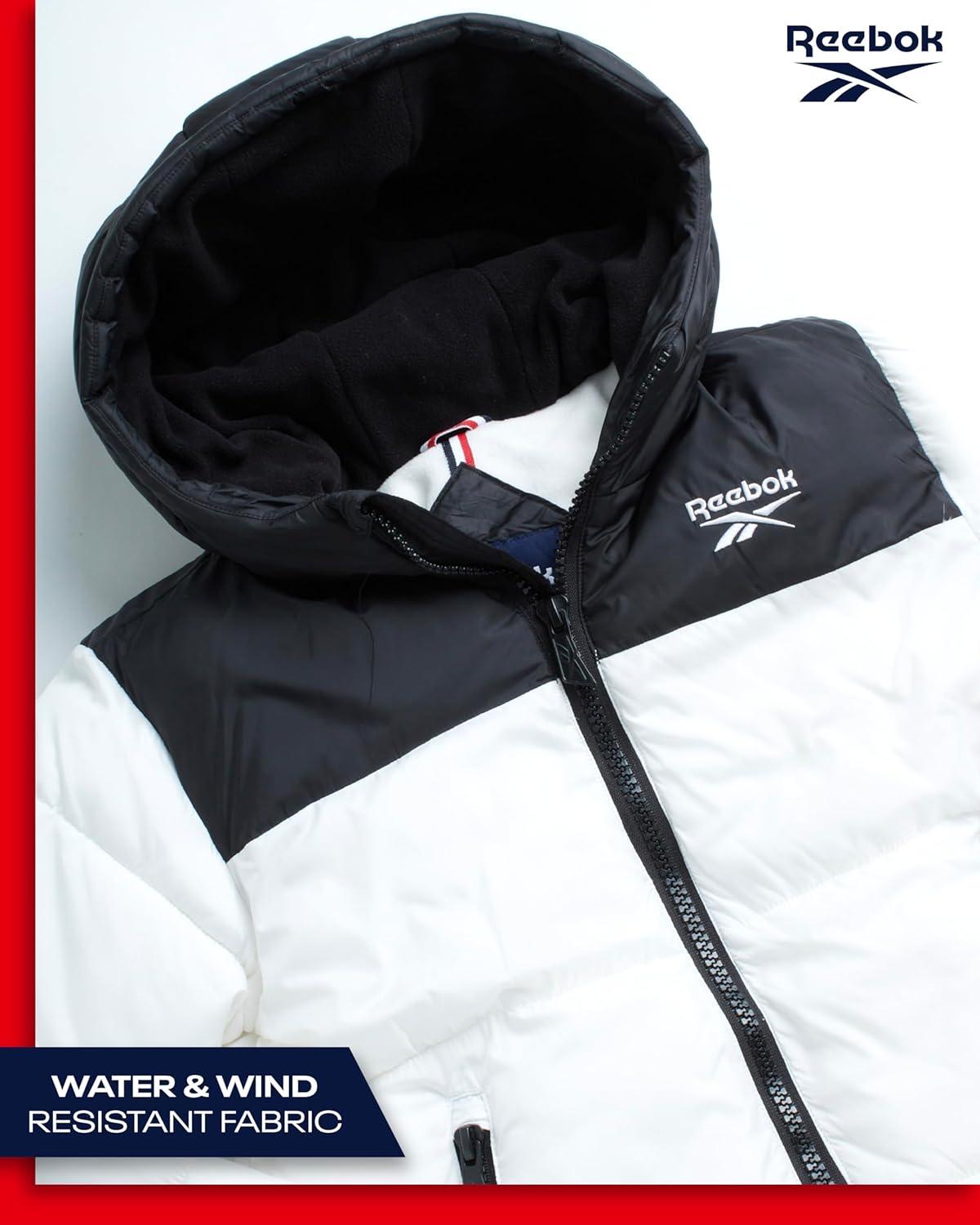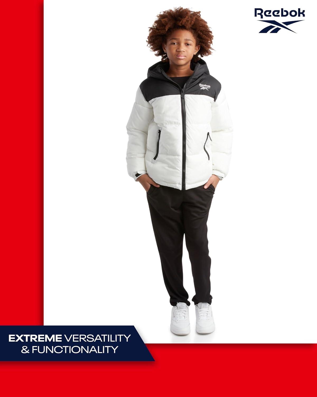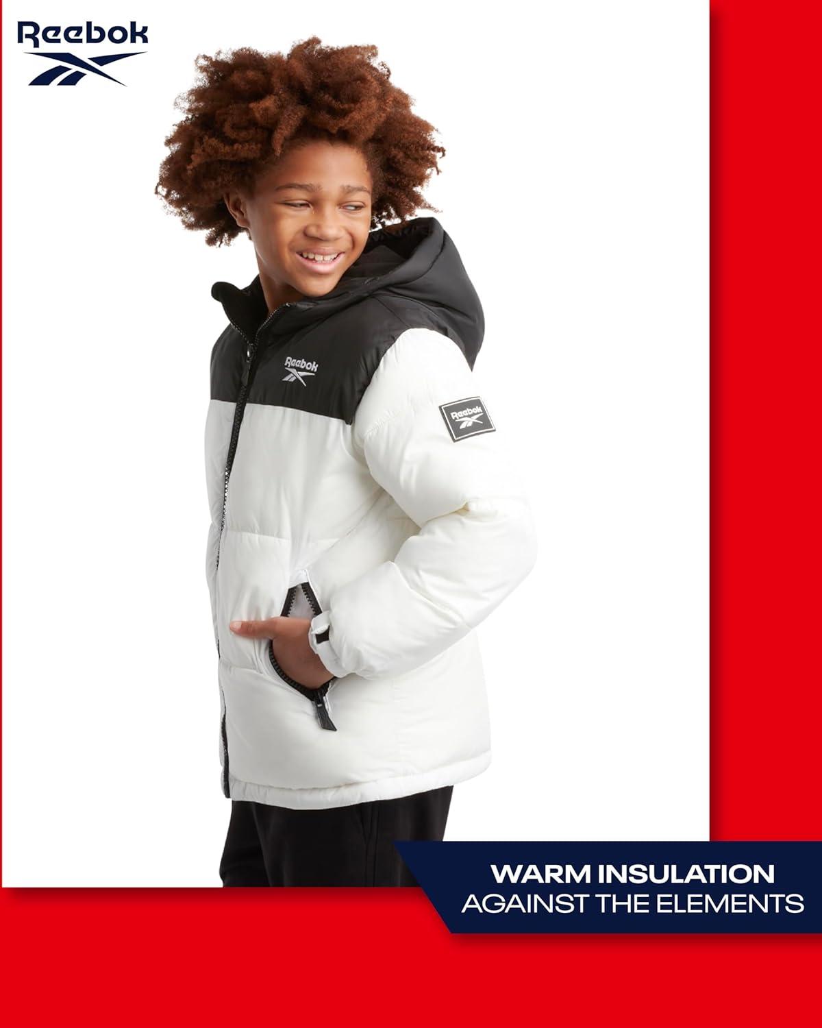 Keep him warm and protected with the Reebok Boys Puffer Jacket, a heavyweight boys winter coat designed for ultimate comfort and durability. Perfect for cold-weather adventures, this insulated boys puffer jacket combines superior warmth with a sleek design that works for school days, family outings, and outdoor play. Whether you’re searching for a winter jacket for boys, kids winter coat, or a reliable boys winter jacket, this option delivers everything you need for harsh winter conditions. Featuring a water- and wind-resistant shell, this boys winter coat offers outstanding protection against snow, rain, and cold winds. The insulated hood, full zip closure, and snap placket provide a secure fit that traps heat, making it perfect for winter sports or everyday wear. Designed to fit a range of sizes, from boys jackets size 7-8 to boys jackets size 14-16, it ensures growing kids stay warm all season long. Parents love the versatility of this coat—it’s ideal for boys winter coats size 10-12, boys winter coats size 14-16, or even as a puffer jacket for boys that pairs effortlessly with jeans, joggers, or school uniforms. Deep front pockets keep hands warm and essentials secure, making it practical for active lifestyles. Built with durability in mind, this kids winter jacket withstands tough weather and frequent washes without losing shape or insulation. It’s a must-have in any collection of boys' outerwear jackets & coats, offering the perfect combination of style, warmth, and function. For those cold winter days, trust Reebok to keep your child comfortable, protected, and looking great in this premium boys puffer jacket.