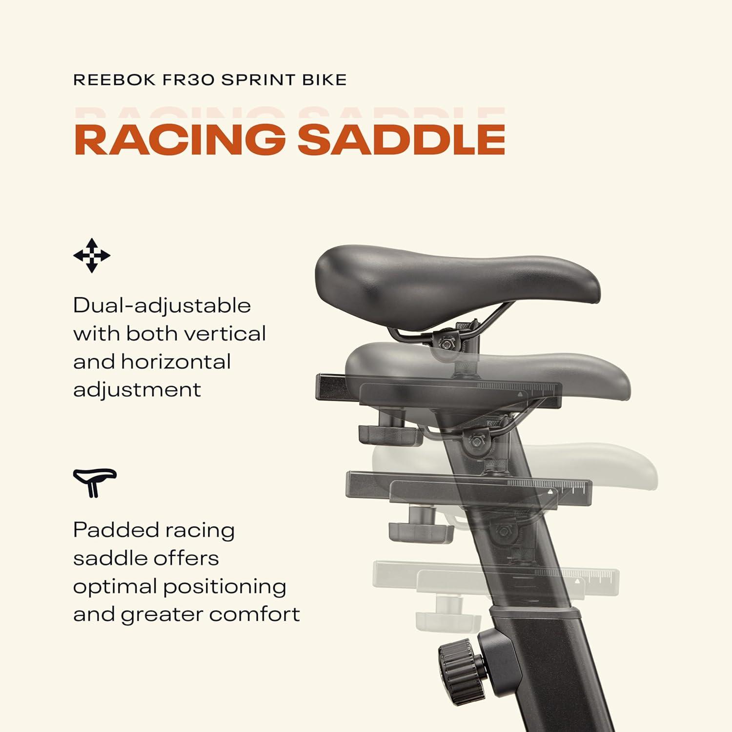 Reebok Fitness Stationary Bike: Bluetooth Compatible Indoor Cycling Bike, 24 Resistance Levels, 12 Workouts, Upright Exercise Bike with Gel Pad Saddle(Reebok FR30 Sprint Bike)