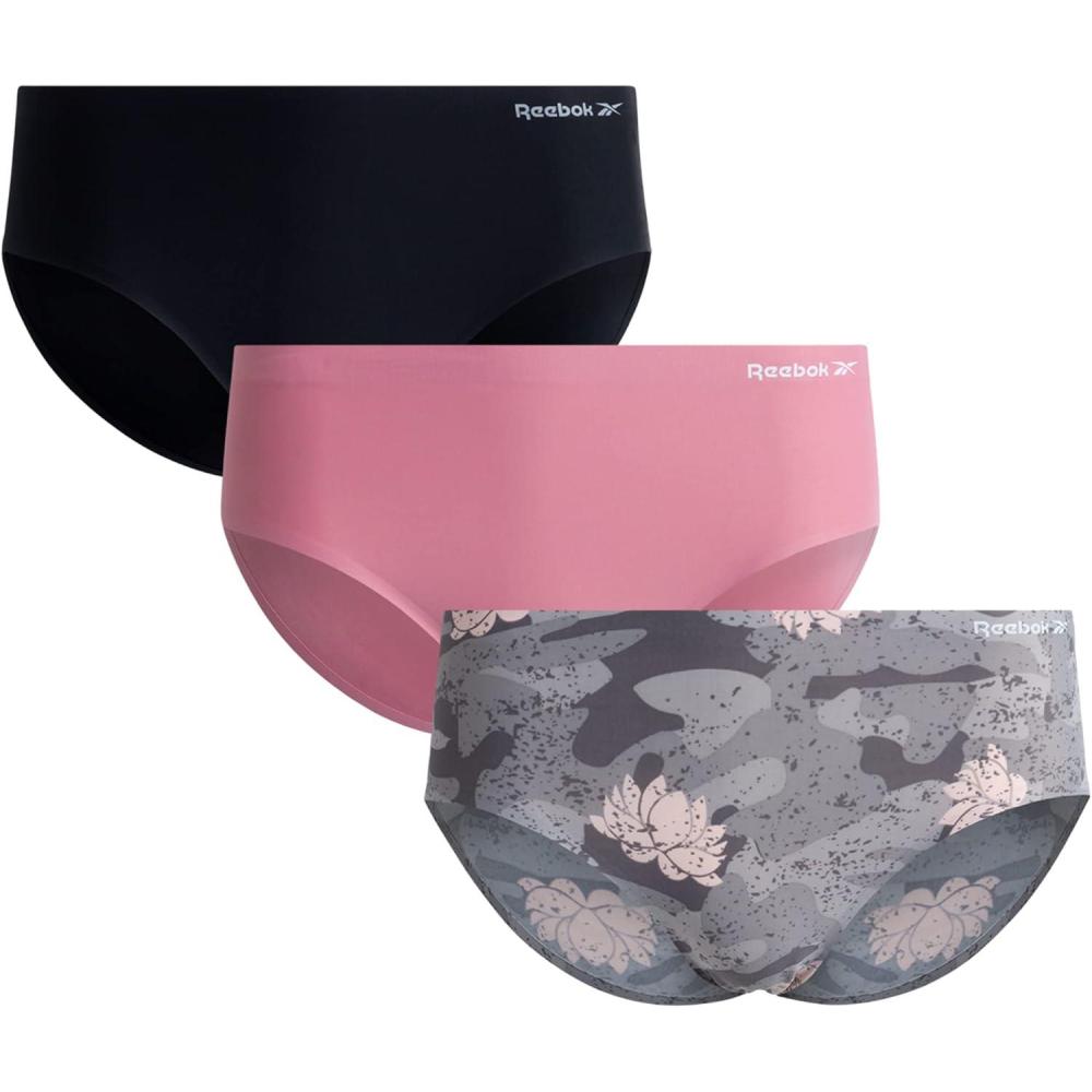 Reebok Hipster Panties for Women - 3 Pack Stretch Performance Seamless Underwear with Relaxed Tagless Waist (S-XL)(Sharkskin/Fox Glove/Black)