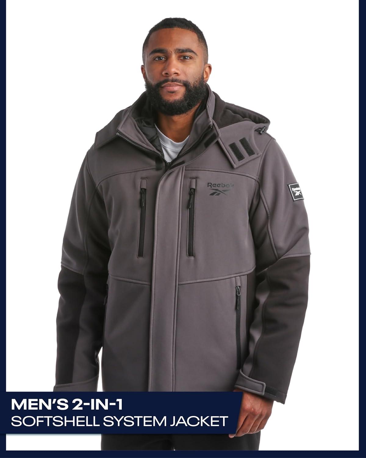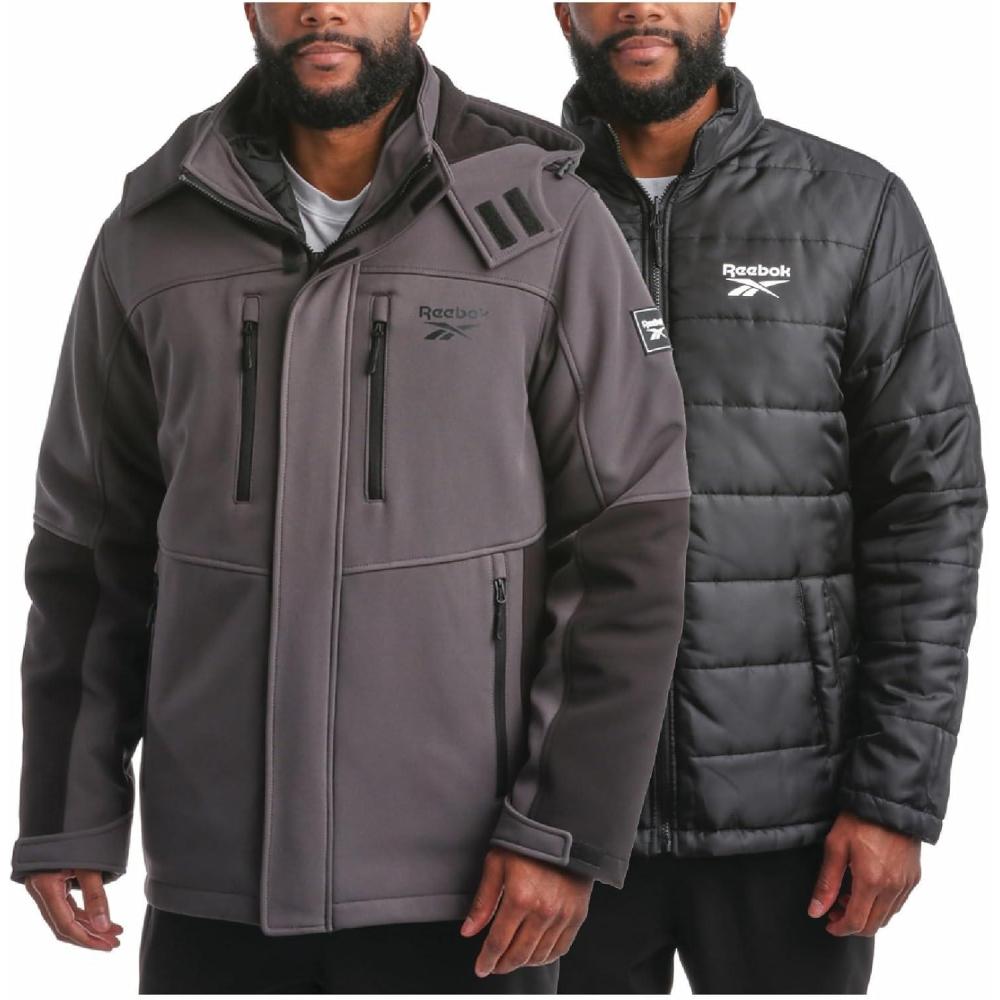 Stay ready for every season and every adventure with the Reebok 2-in-1 system built to take on whatever the forecast throws your way. This versatile piece combines a durable soft shell jacket mens with a removable black puffer jacket that delivers warmth when temperatures fall. Wear each separately when you just need a lighter zip up jacket men for daily life. Engineered with weather-resistant fabrics, this water proof jacket mens is designed to repel wind, snow, and rain. From a rugged hiking jacket men to a sleek mens casual jacket for weekends out. The insulated puffer coat offers heat-trapping comfort, while the shell functions as a durable men windbreaker jacket for transitional weather. More than just another mens jacket winter option, this mens winter jackets is a reimagined take on mens coats and jackets. It's built for movement without bulk, making it an excellent snowboarding jacket or even a lightweight mens ski jacket. With multiple secure pockets, a protective hood, and an adjustable collar, this mens jacket with hood delivers both utility and confidence. This men's winter jacket feels just as good running errands. Whether you're searching for casual jackets for men to wear with jeans, a tough men puffer jacket, men winter clothes, mens zip up jacket, men's fall jacket, mens softshell jacket, mens windbreaker jackets, winter coat for men, waterproof hoodie, men winter coats, hiking jacket for trails, or stylish bomber jackets for men that double as mens outerwear, this winter jacket men does it all. From winter hoodies for men lovers to those in need of a durable mens parka, this men's windbreakers, men coat, coat for men, men's outerwear jackets & coats system. For anyone looking for a winter coat men can trust, black windbreaker or a snow jacket men designed for adventure, this Reebok softshell jacket men offers style, protection, and adaptability. It's the all-in-one winter jacket for men that belongs in every closet.