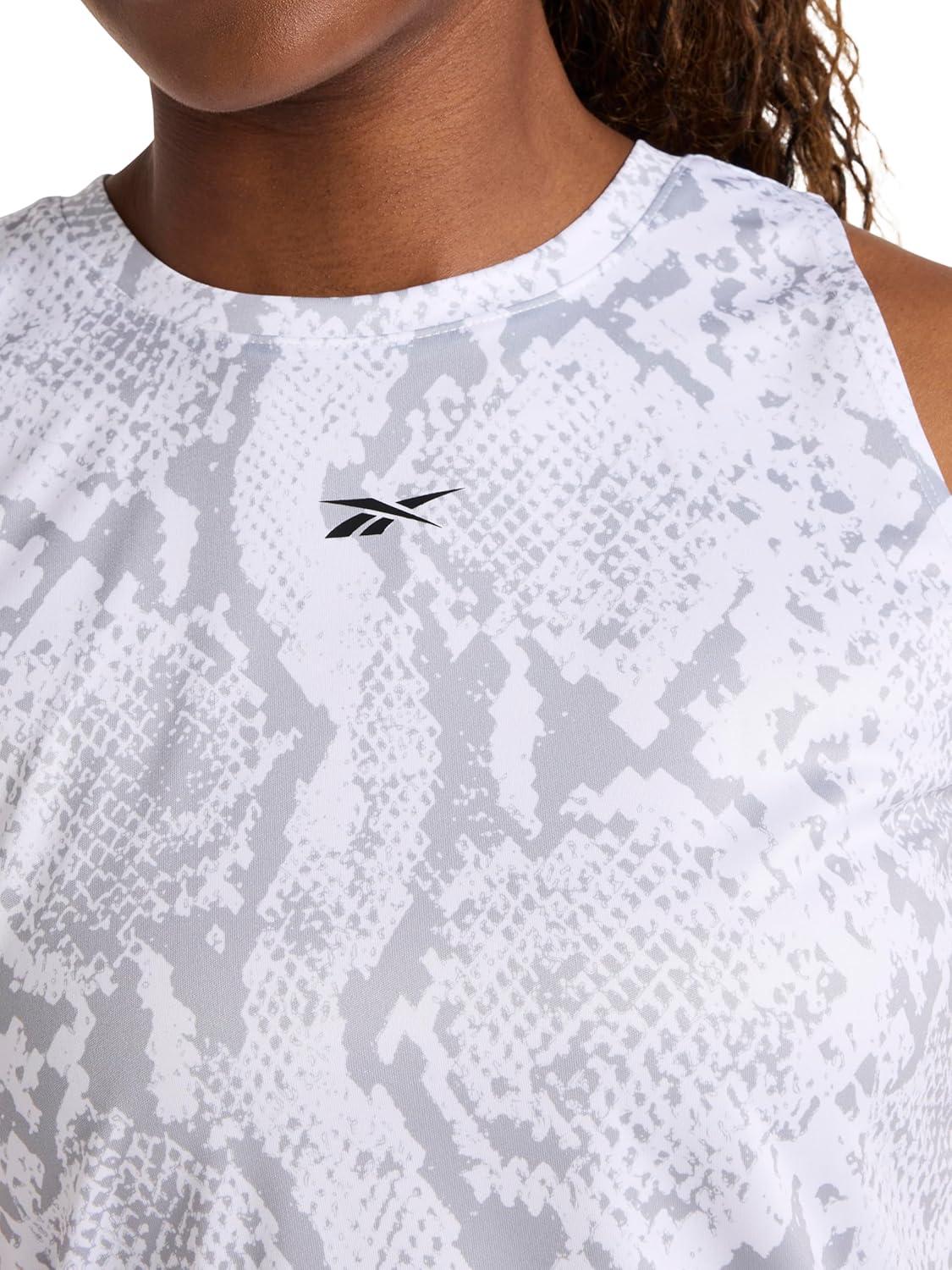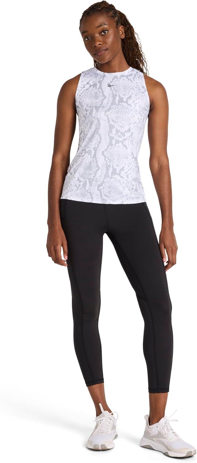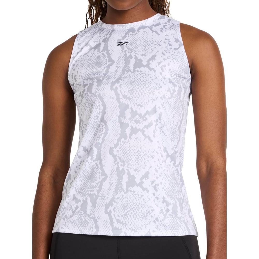 Bring edgy energy to every move in the Reebok Women’s ID Performance Tech Snake Crewneck Tank Top. Made from lightweight softhand poly fabric, it’s all about moisture-wicking performance that keeps you dry and focused, while an allover snake print lends contemporary flair. A relaxed fit and sleek crew neckline create an athletic-meets-street vibe for training or everyday wear.