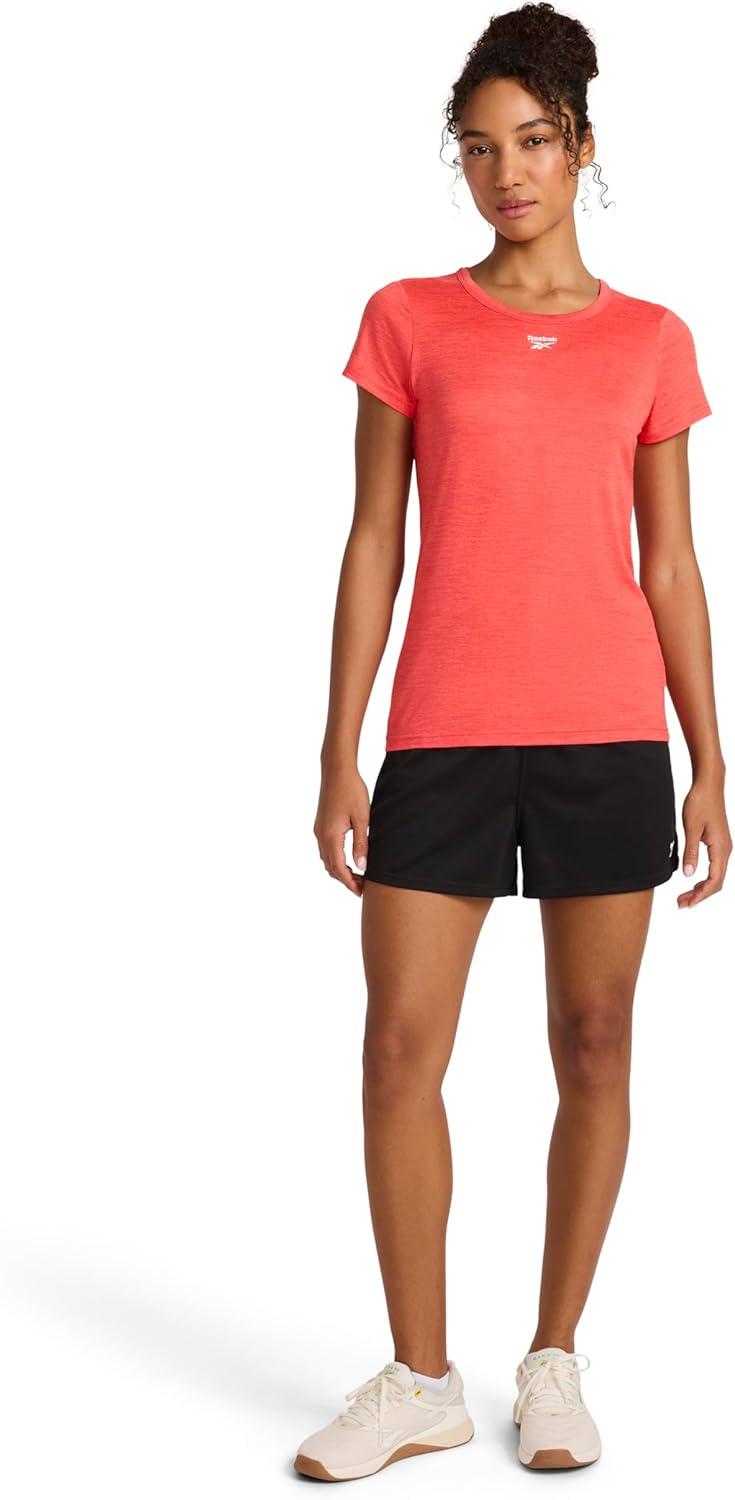 Crank up your training intensity in the Reebok Women’s Off The Charts Performance T-Shirt. Crafted from marled soft jersey with added stretch, it moves effortlessly with you through every rep and step. Lightweight comfort meets a stacked logo for a sharp, athletic look that dominates in and out of the gym.