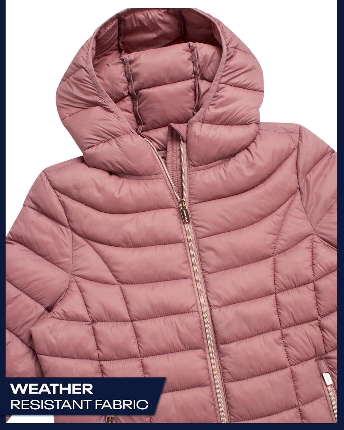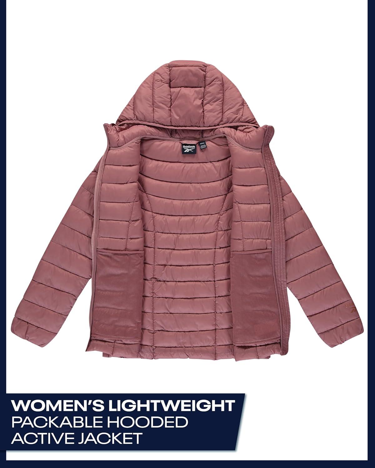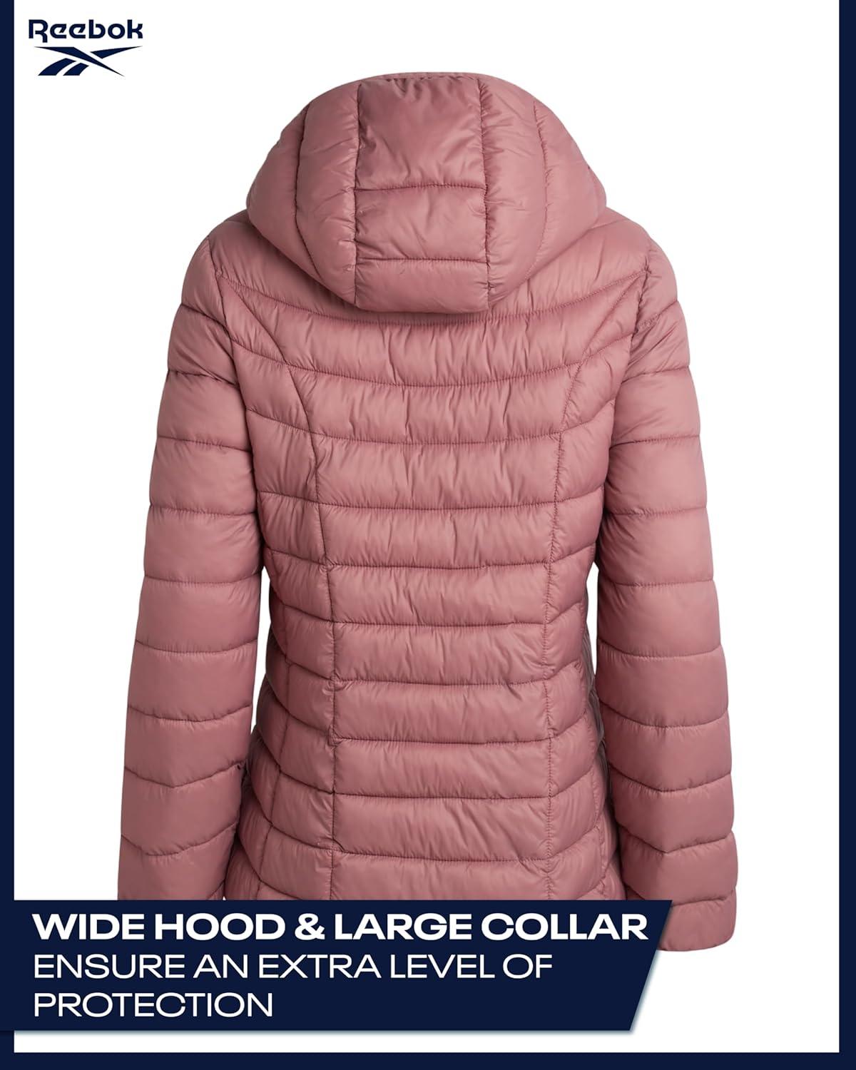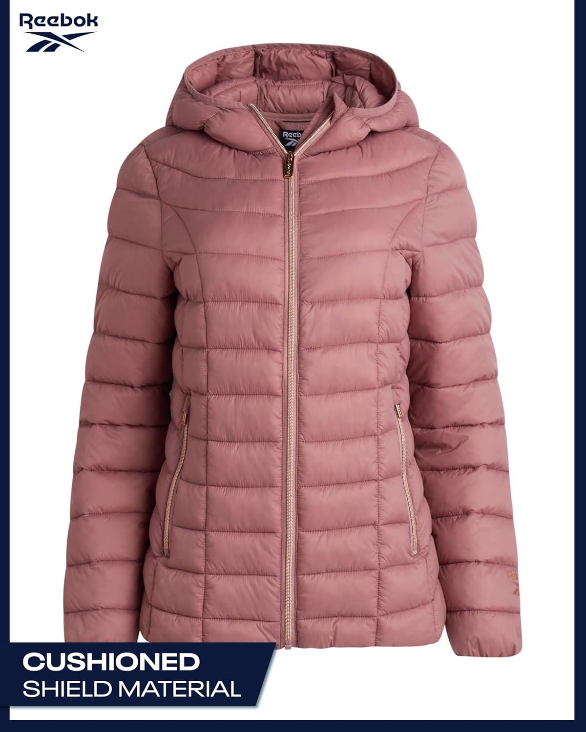 Reebok Womens Puffer Jacket - Lightweight Packable Snow Glacier Shield Quilted Winter Coat for Women with Hood & Zip Pockets(Dusty Rose)