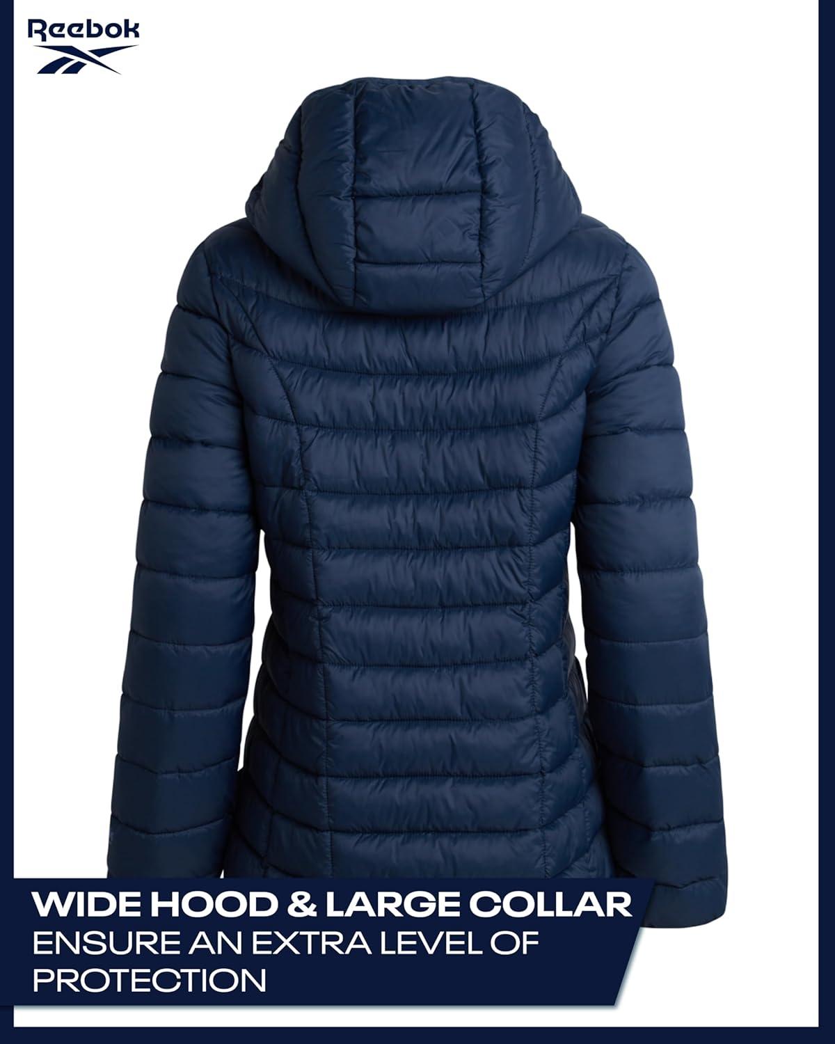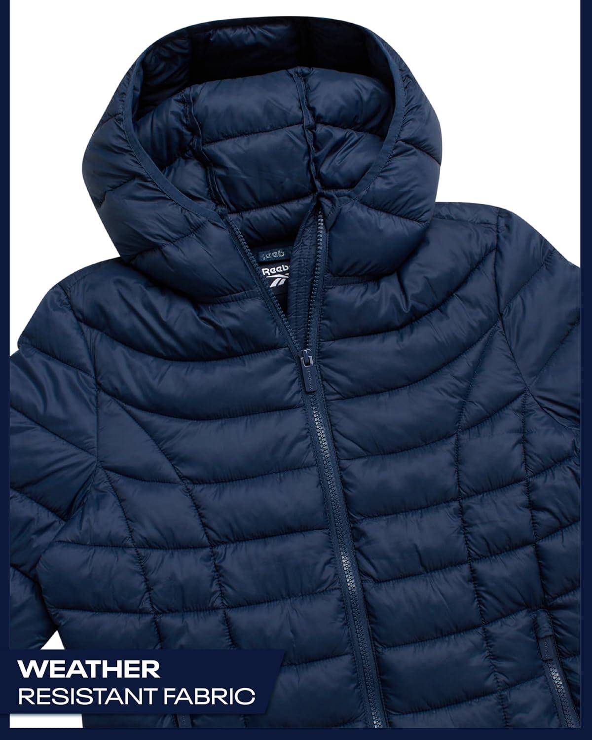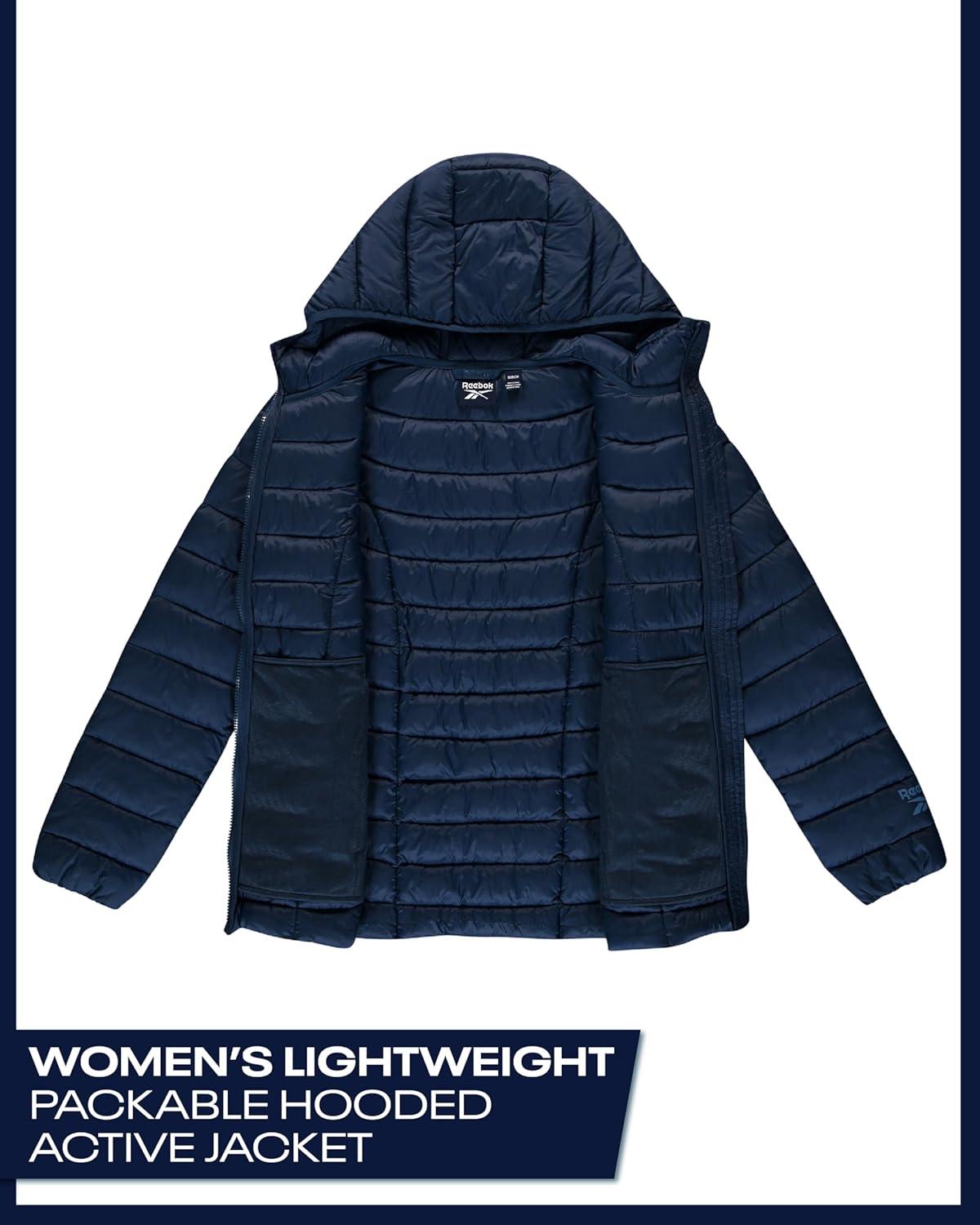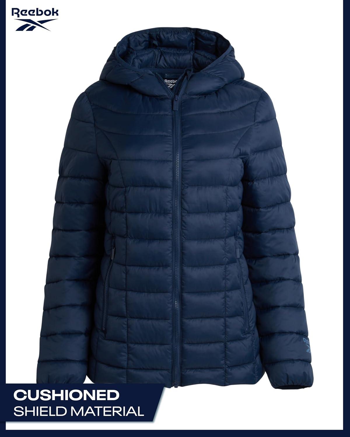 Reebok Womens Puffer Jacket - Lightweight Packable Snow Glacier Shield Quilted Winter Coat for Women with Hood & Zip Pockets(Navy)