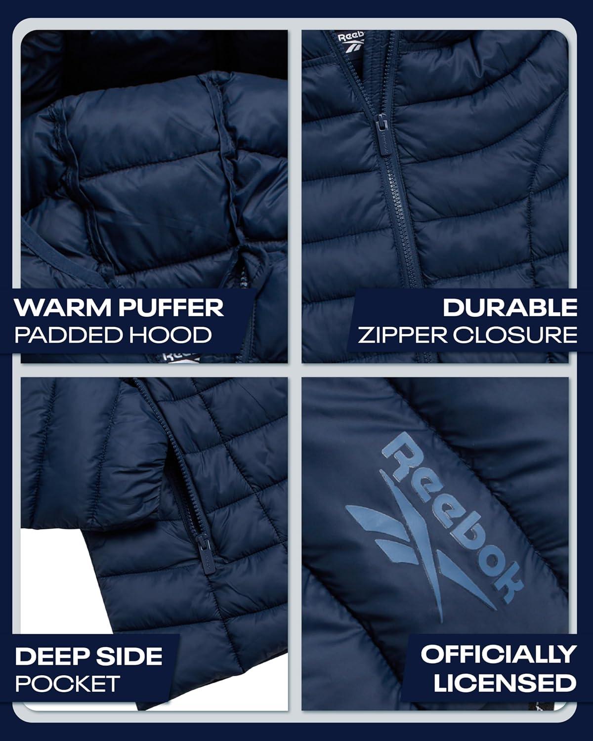 Reebok Womens Puffer Jacket – Lightweight Packable Snow Glacier Shield Quilted Winter Coat for Women with Hood & Zip Pockets(Navy)