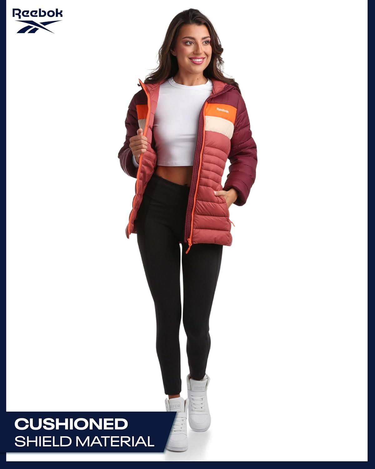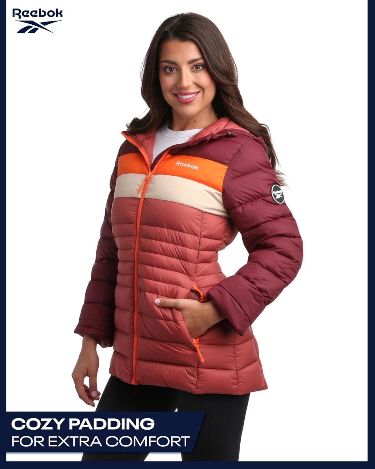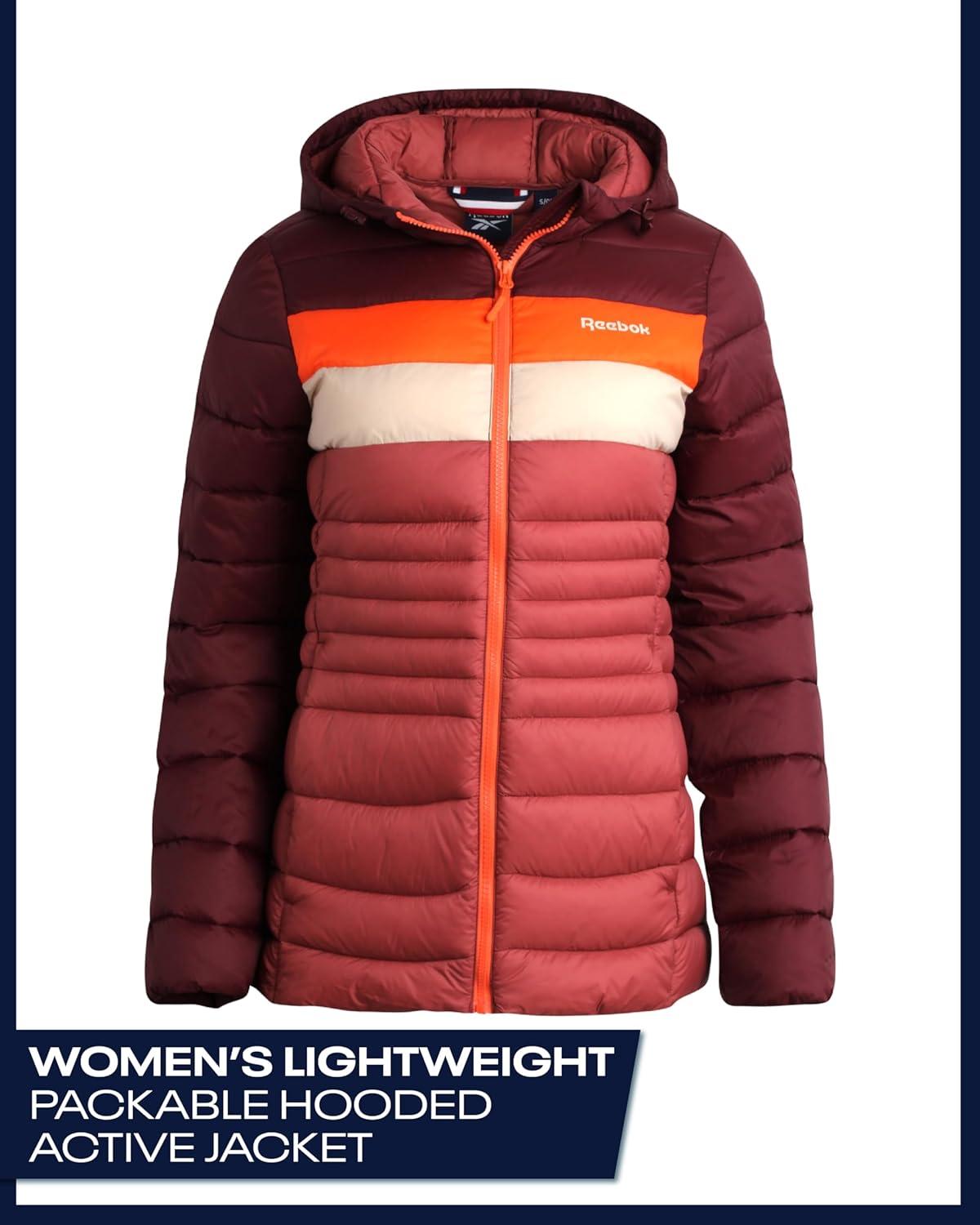 Reebok Womens Puffer Jacket – Lightweight Packable Snow Glacier Shield Quilted Winter Coat for Women with Hood & Zip Pockets(Terracotta)