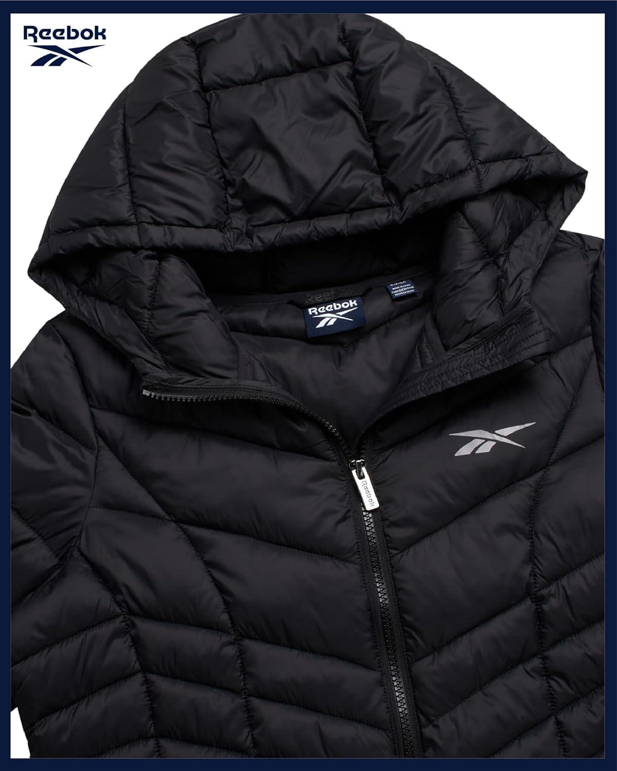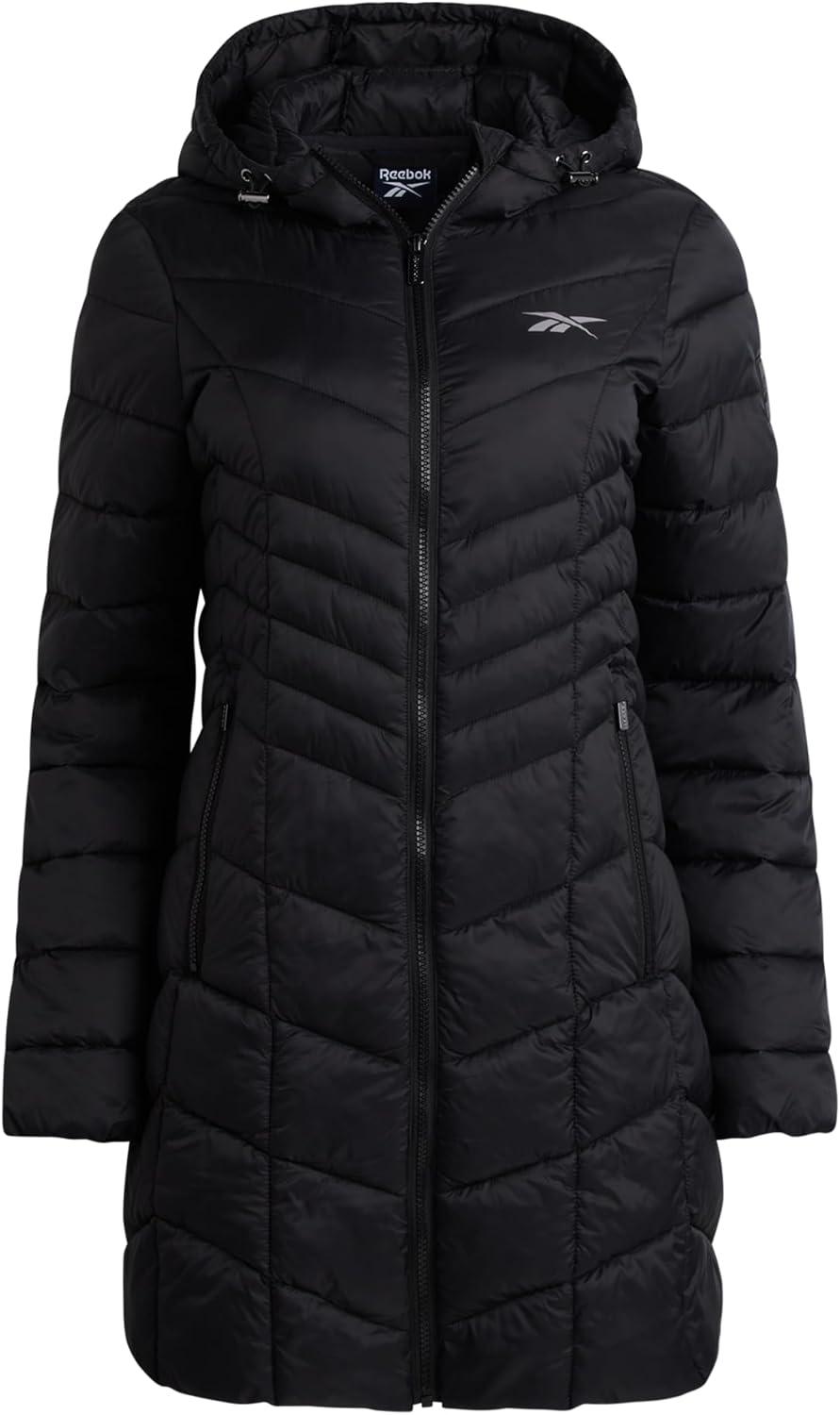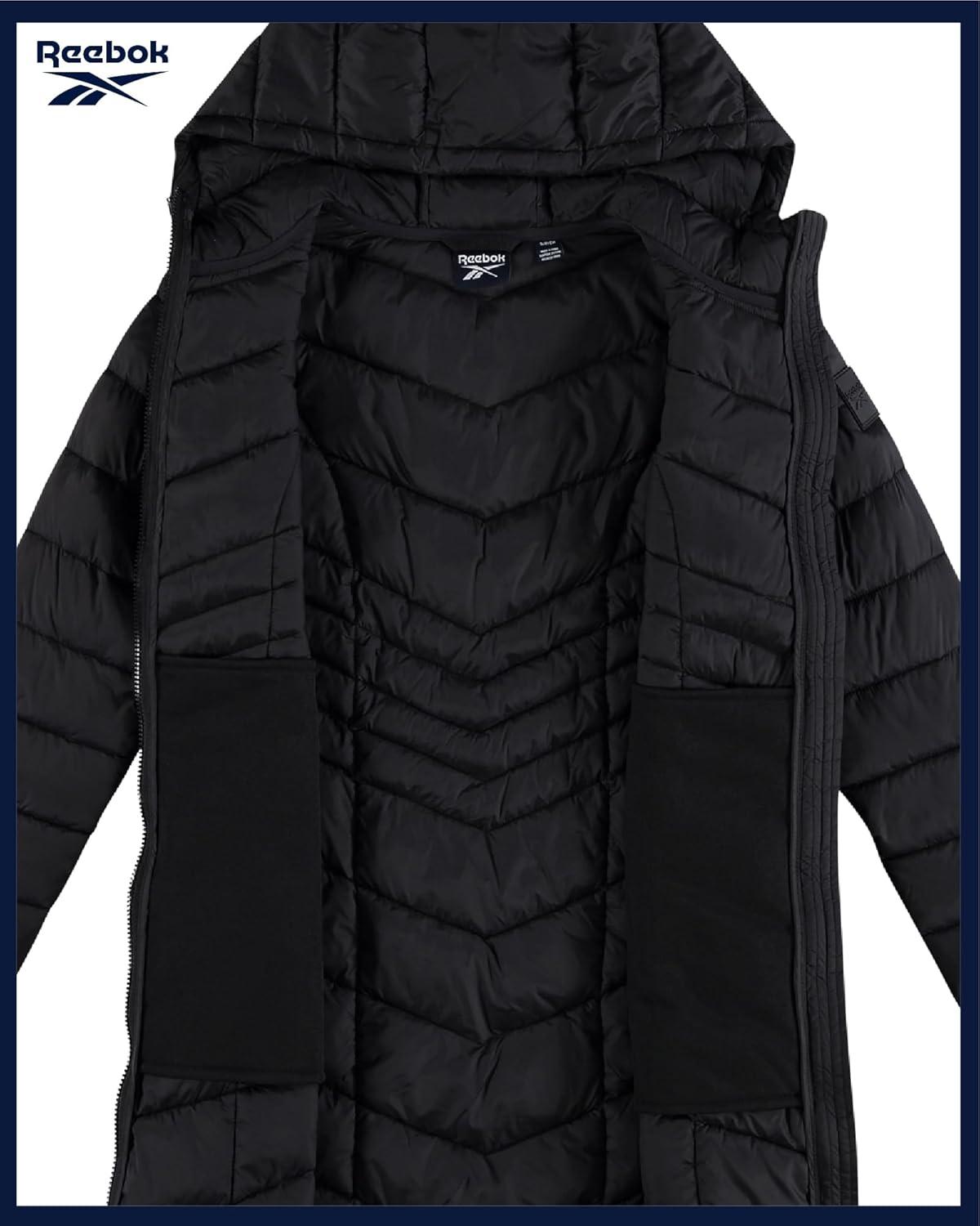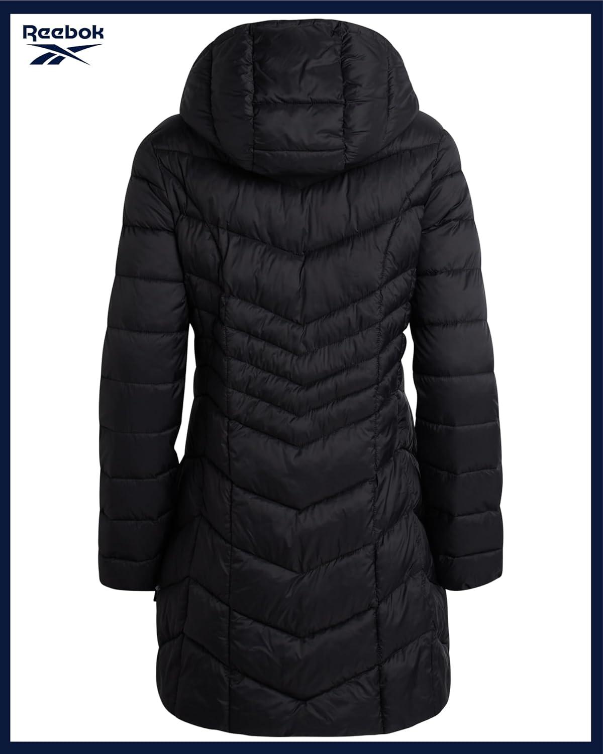 Reebok Womens Puffer Jacket – Long Quilted Hooded Winter Coat for Women – Lightweight Packable Outerwear Jackets for Women(Black Ink)