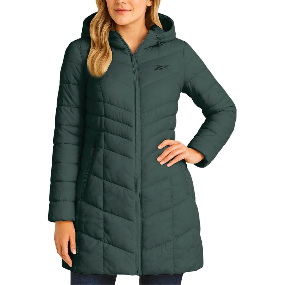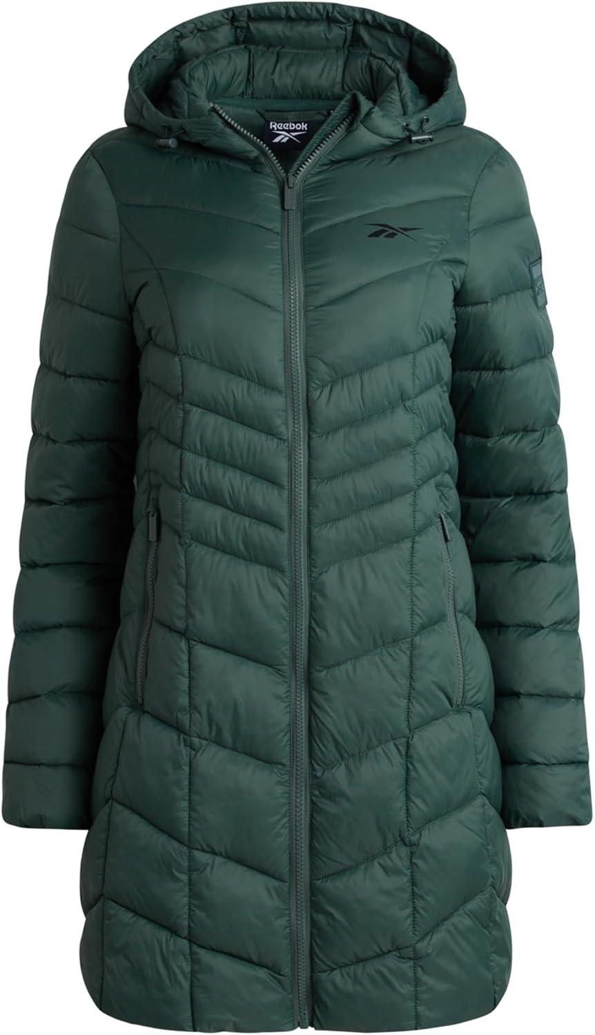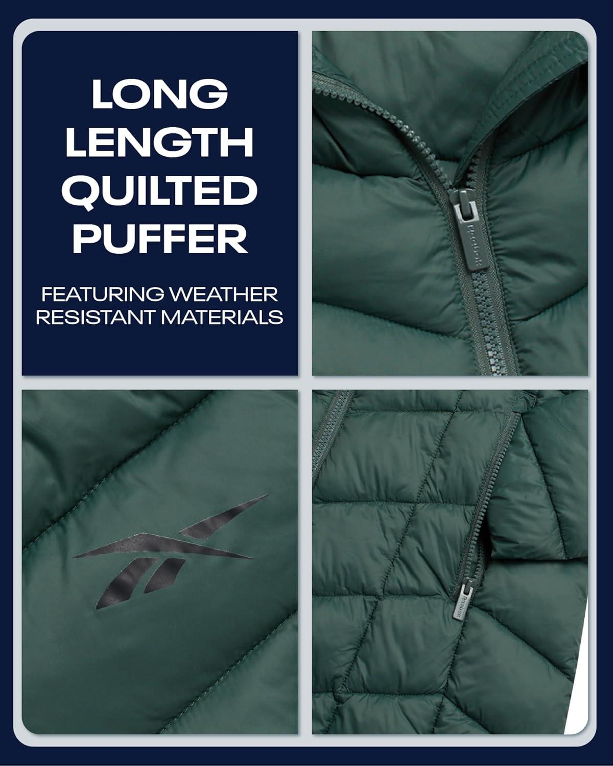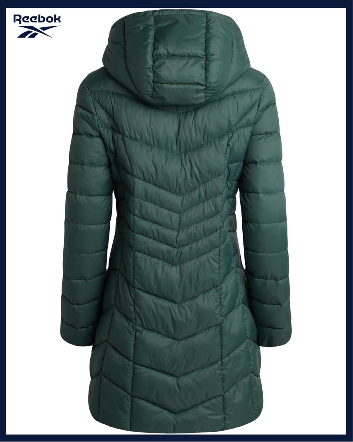 Reebok Womens Puffer Jacket – Long Quilted Hooded Winter Coat for Women – Lightweight Packable Outerwear Jackets for Women(Hunter Green)