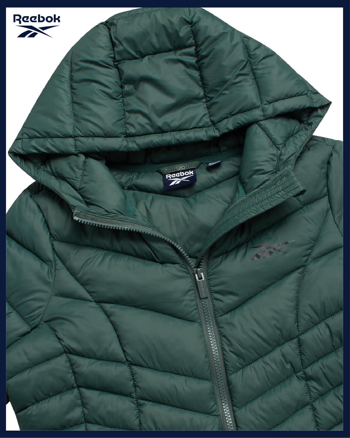 Reebok Womens Puffer Jacket - Long Quilted Hooded Winter Coat for Women - Lightweight Packable Outerwear Jackets for Women(Hunter Green)